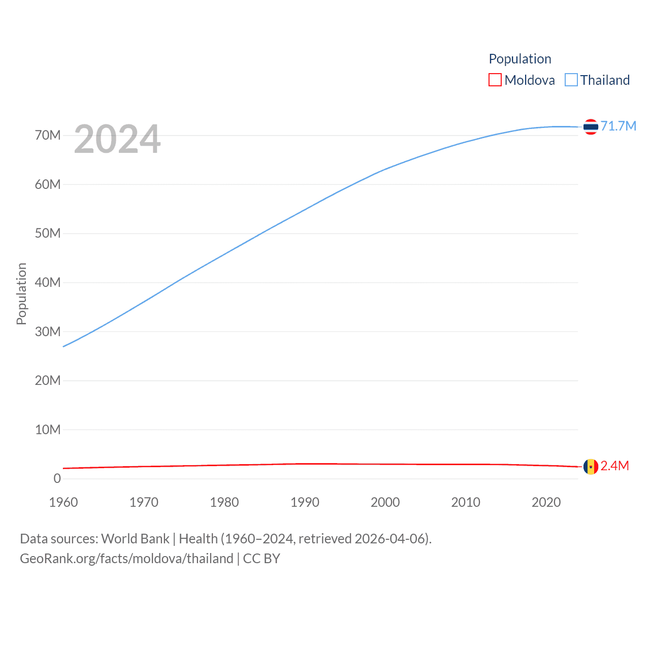 Moldova has a population of 2.4M (ranked 143/197), compared with 71.7M in Thailand (ranked 20/197). Moldova's land area is 12,714 sq mi versus 197,256 sq mi for Thailand (ranked 135th vs. 50th).