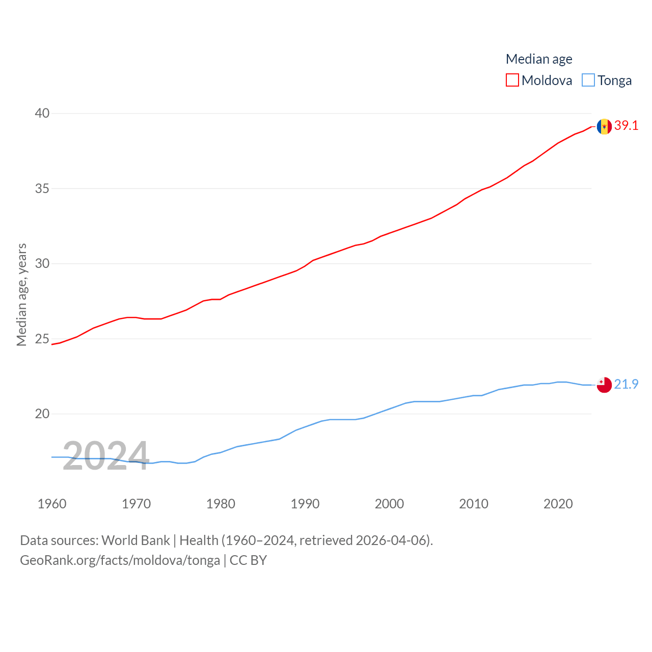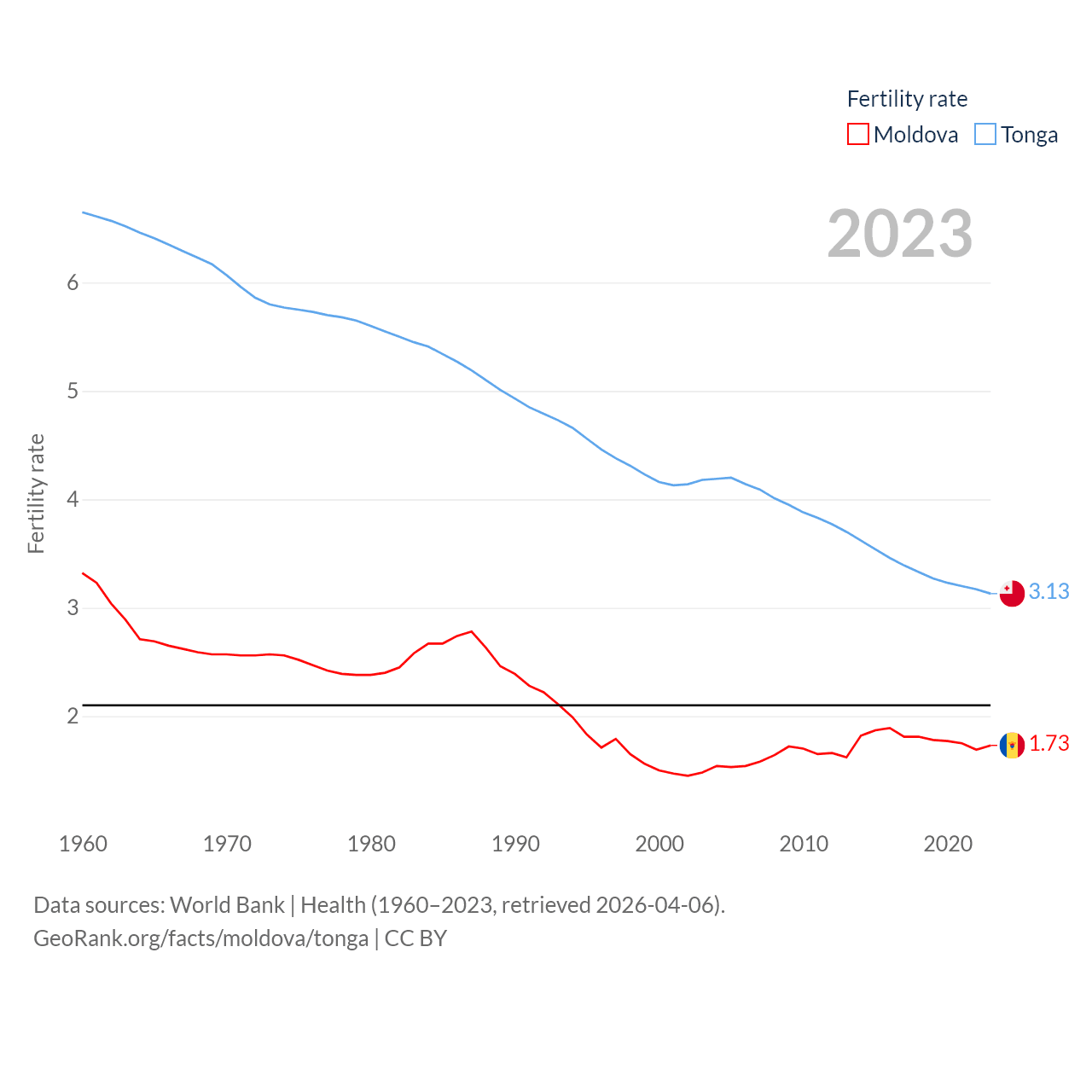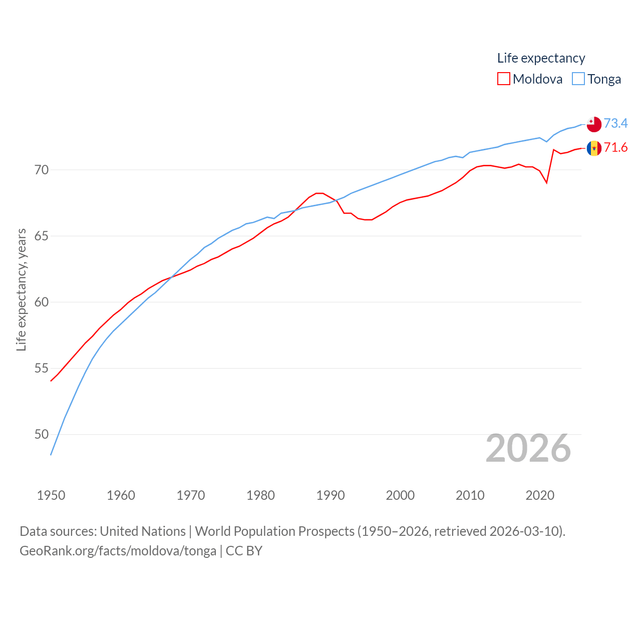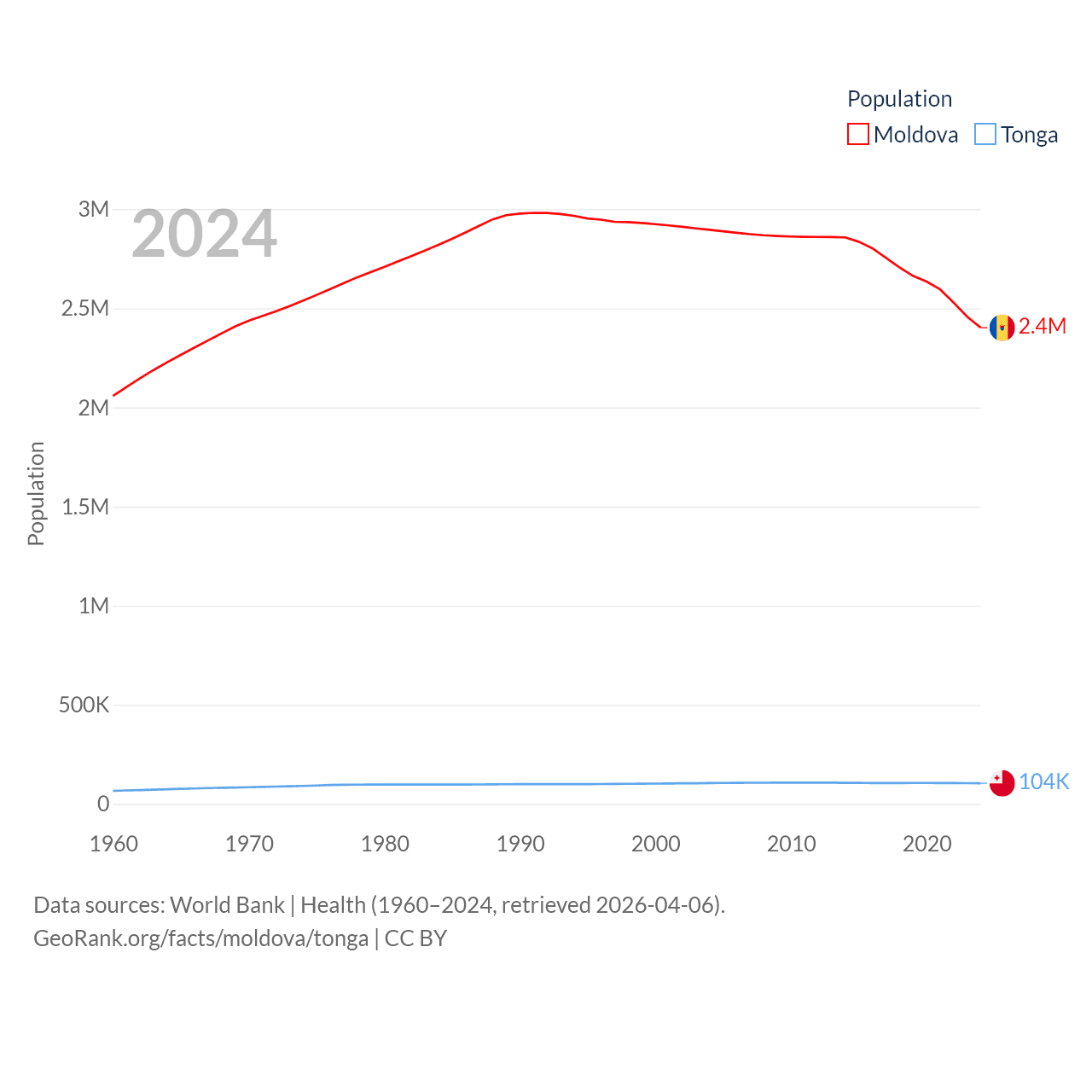 Moldova has a population of 2.4M (ranked 143/197), compared with 104K in Tonga (ranked 183/197). Moldova's land area is 12,714 sq mi versus 278 sq mi for Tonga (ranked 135th vs. 176th).