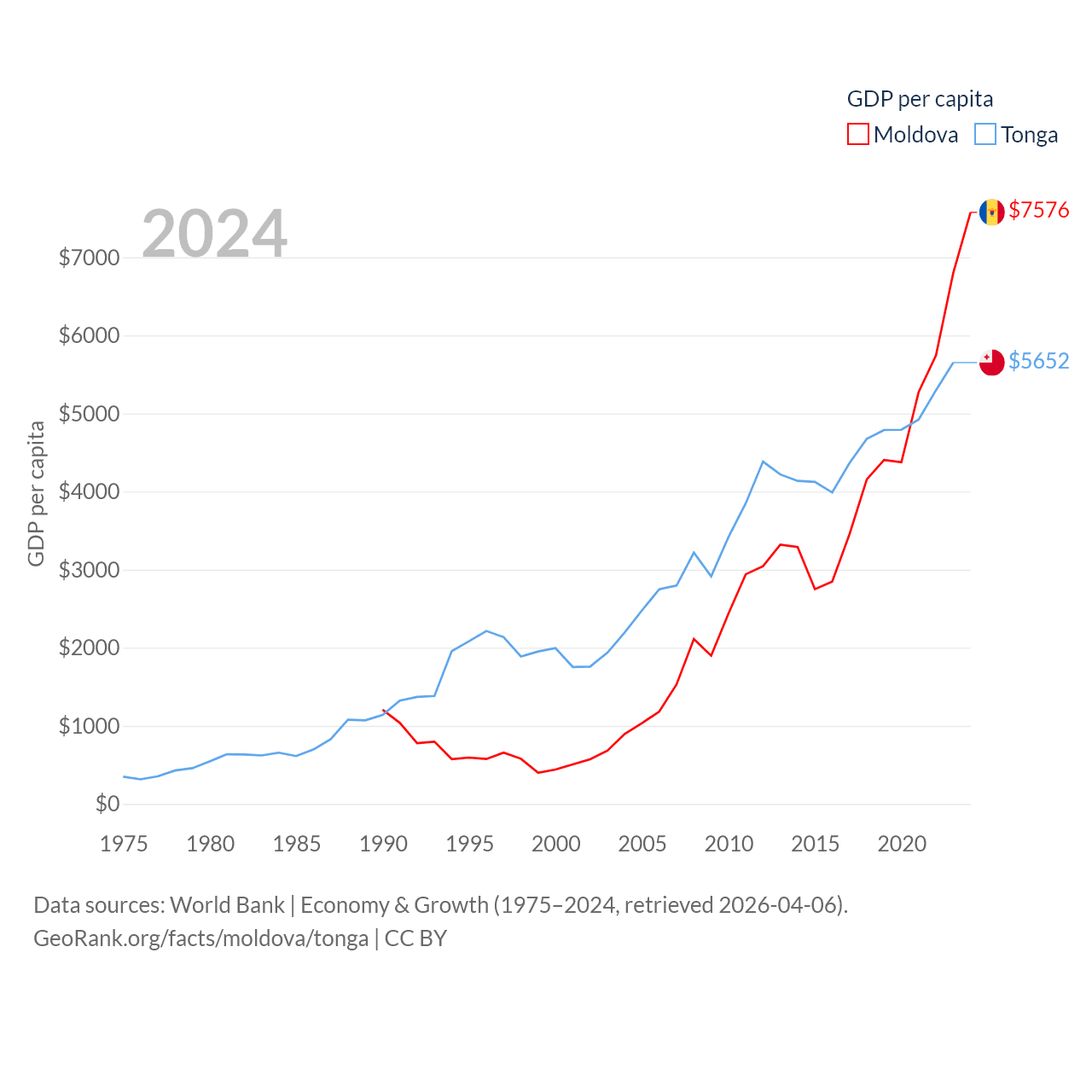 By GDP, Moldova ranks 134/197 ($18.2B) and Tonga ranks 191/197 ($591M). By GDP per capita, Moldova ranks 99/197 ($7,576), while Tonga ranks 115/197 ($5,652).