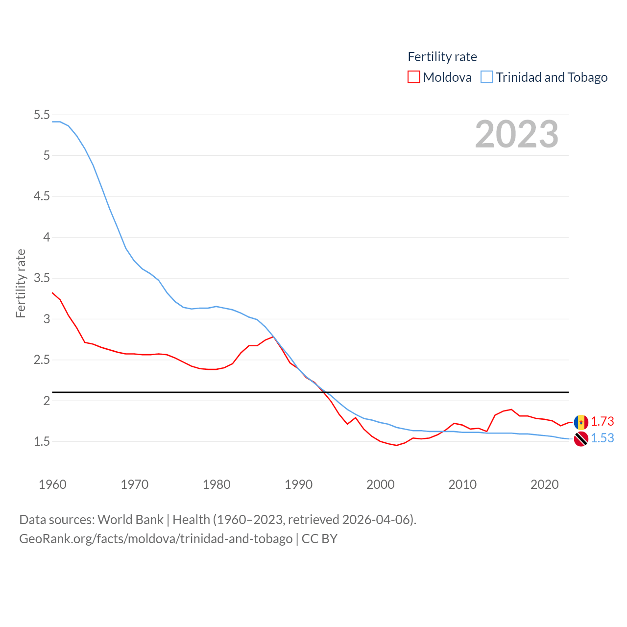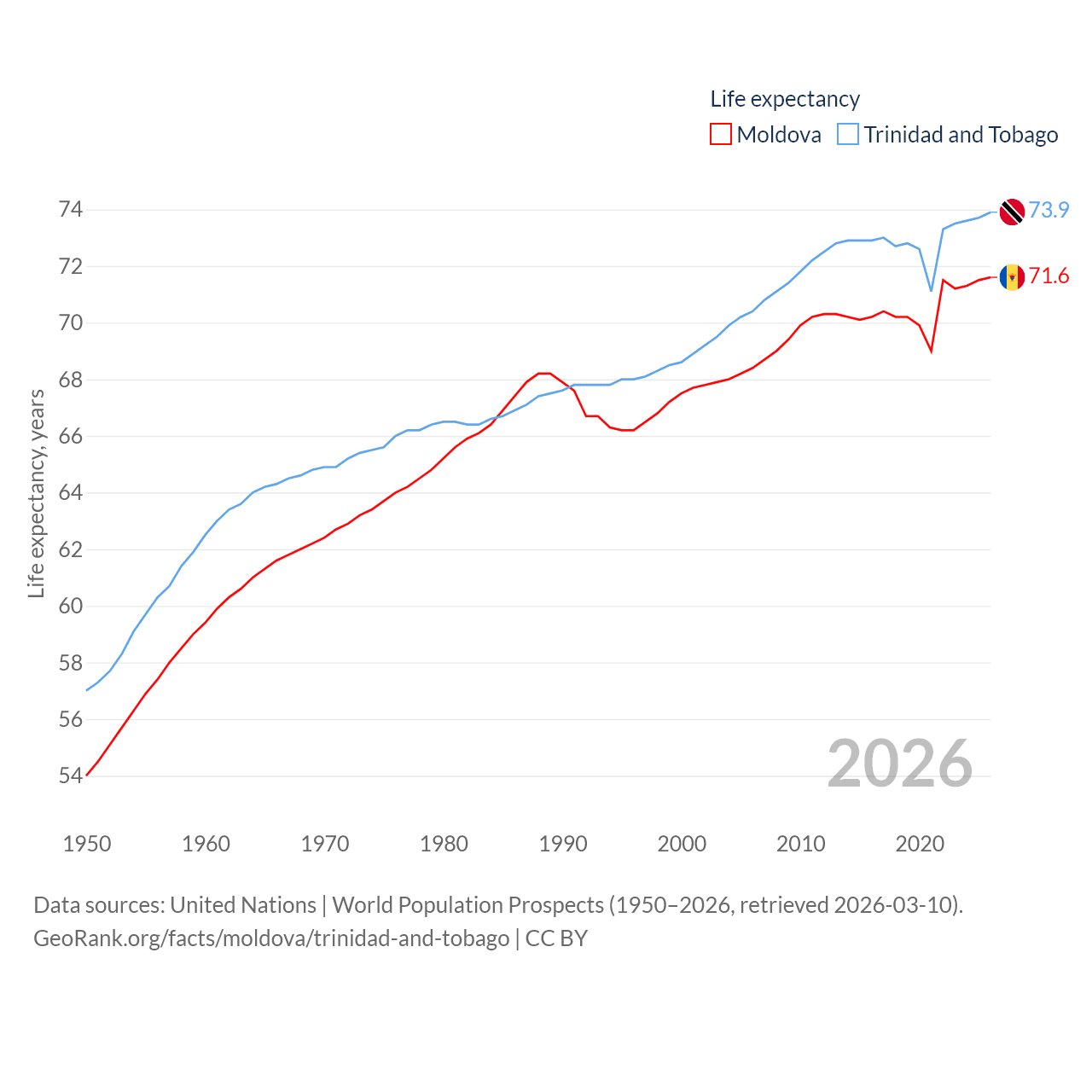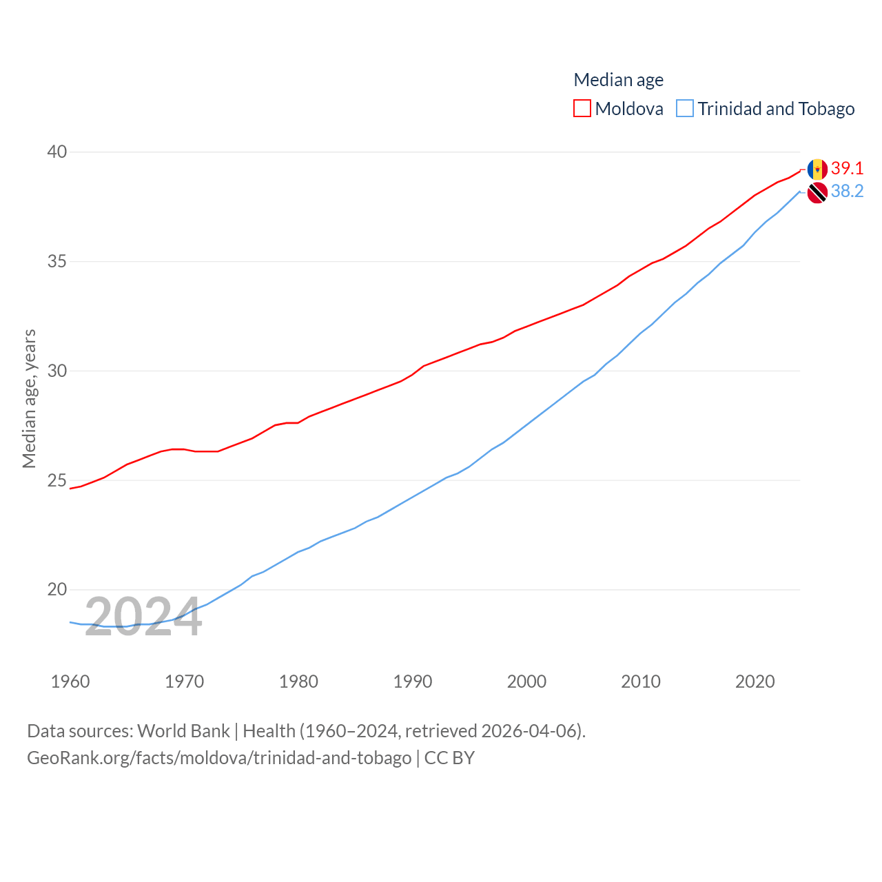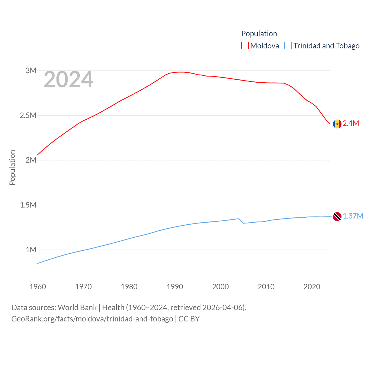 Moldova has a population of 2.4M (ranked 143/197), compared with 1.37M in Trinidad and Tobago (ranked 154/197). Moldova's land area is 12,714 sq mi versus 1,981 sq mi for Trinidad and Tobago (ranked 135th vs. 166th).