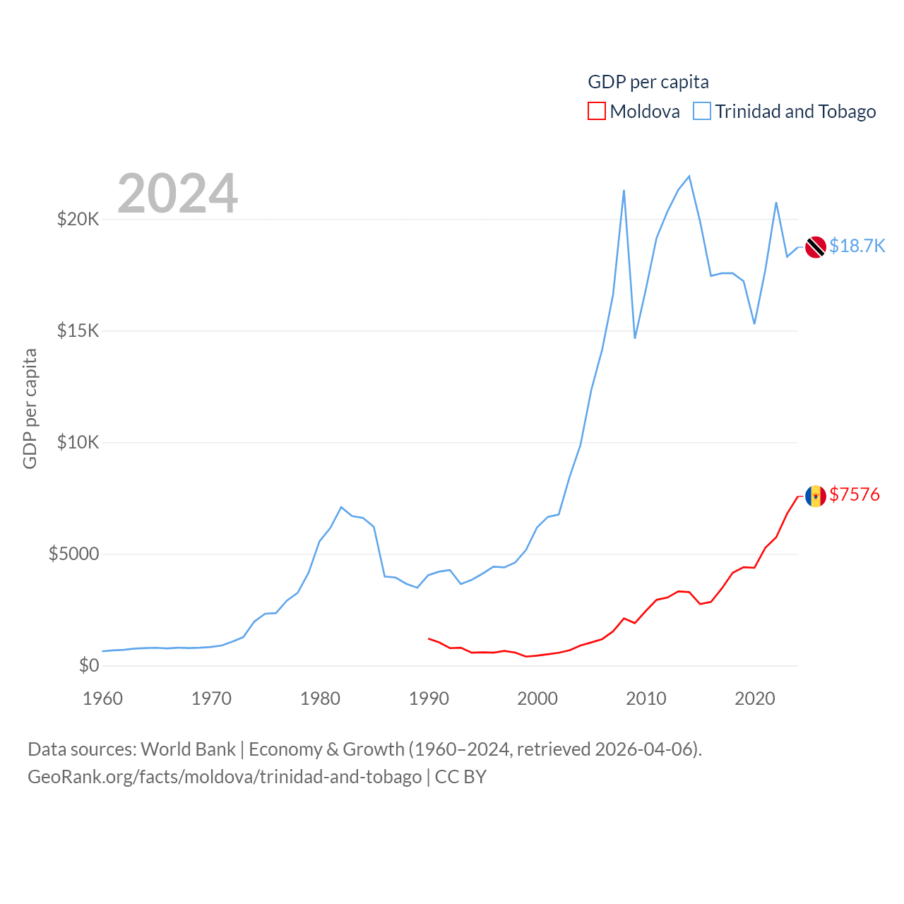 By GDP, Moldova ranks 134/197 ($18.2B) and Trinidad and Tobago ranks 115/197 ($25.6B). By GDP per capita, Moldova ranks 99/197 ($7,576), while Trinidad and Tobago ranks 61/197 ($18,733).