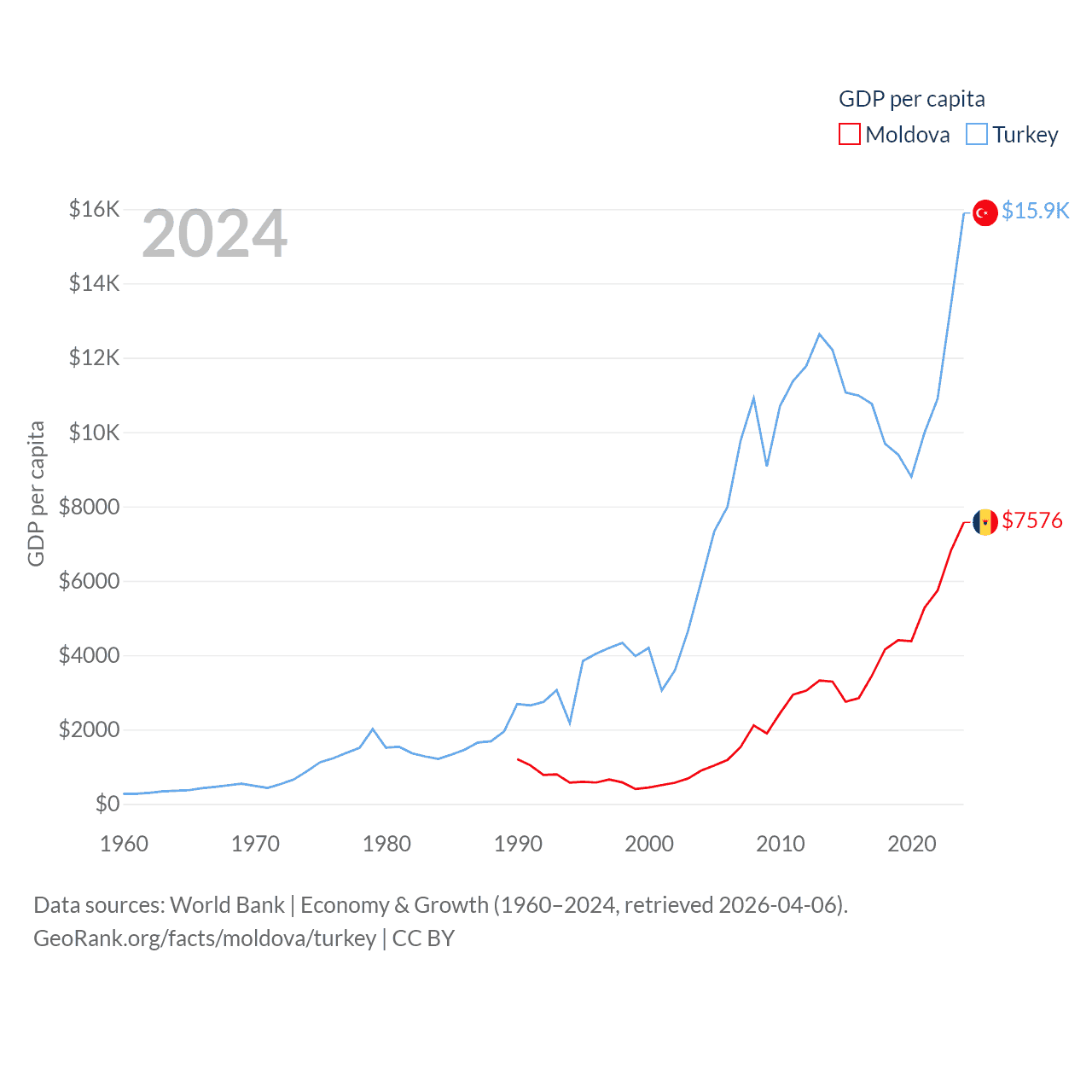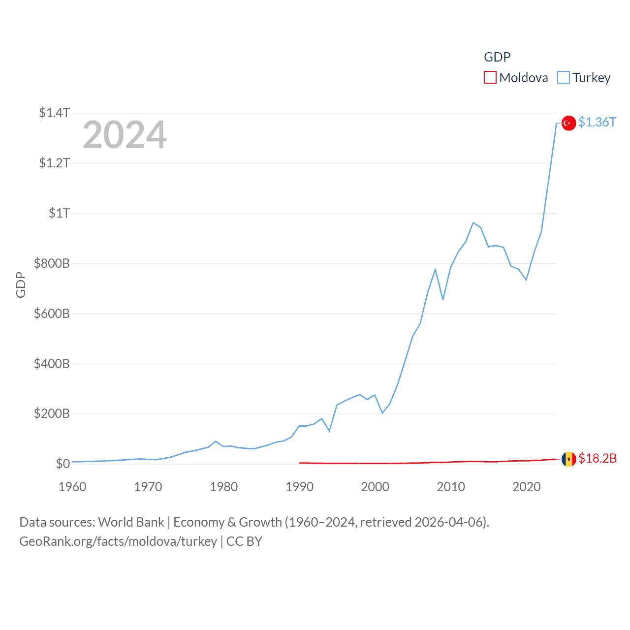 By GDP, Moldova ranks 134/197 ($18.2B) and Turkey ranks 17/197 ($1.36T). By GDP per capita, Moldova ranks 99/197 ($7,576), while Turkey ranks 66/197 ($15,893).