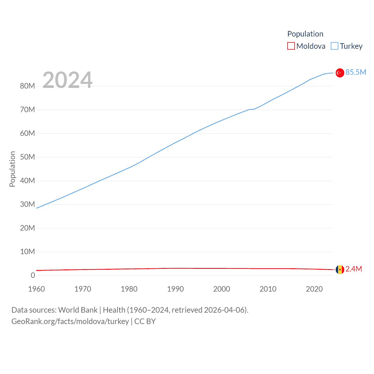 Moldova has a population of 2.4M (ranked 143/197), compared with 85.5M in Turkey (ranked 18/197). Moldova's land area is 12,714 sq mi versus 297,156 sq mi for Turkey (ranked 135th vs. 36th).