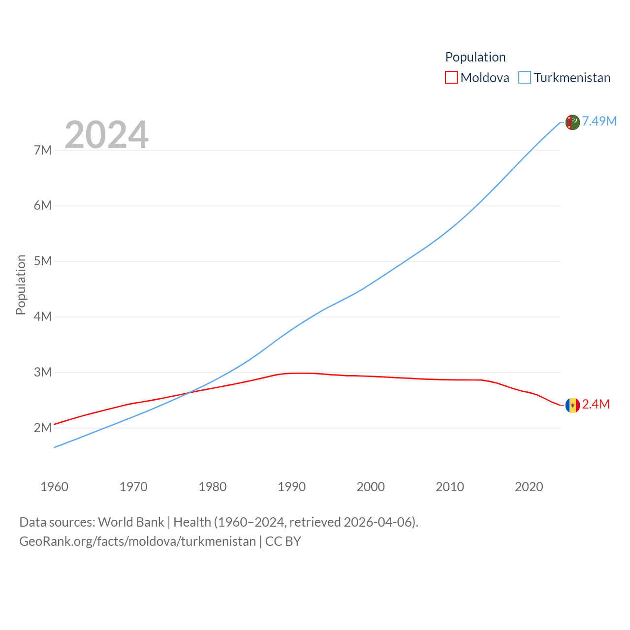 Moldova has a population of 2.4M (ranked 143/197), compared with 7.49M in Turkmenistan (ranked 104/197). Moldova's land area is 12,714 sq mi versus 181,441 sq mi for Turkmenistan (ranked 135th vs. 53rd).