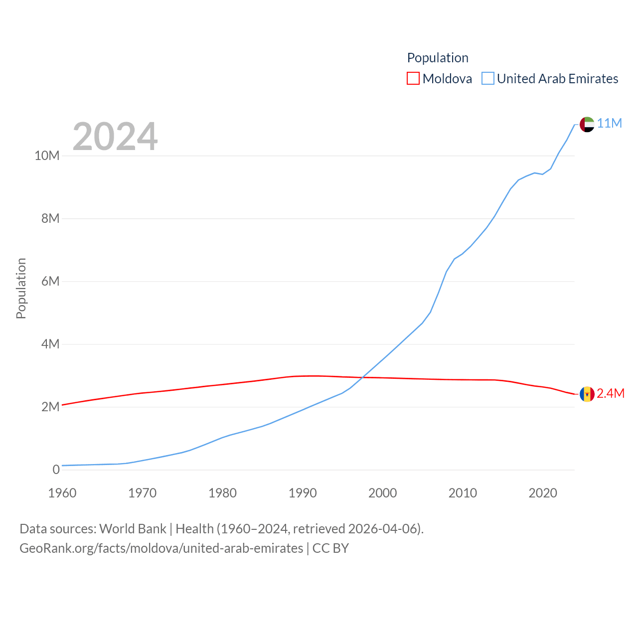 Moldova has a population of 2.4M (ranked 143/197), compared with 11M in The United Arab Emirates (ranked 86/197). Moldova's land area is 12,714 sq mi versus 27,421 sq mi for The United Arab Emirates (ranked 135th vs. 117th).