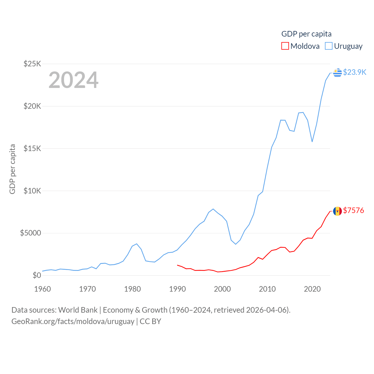 By GDP, Moldova ranks 134/197 ($18.2B) and Uruguay ranks 81/197 ($81B). By GDP per capita, Moldova ranks 99/197 ($7,576), while Uruguay ranks 52/197 ($23,907).