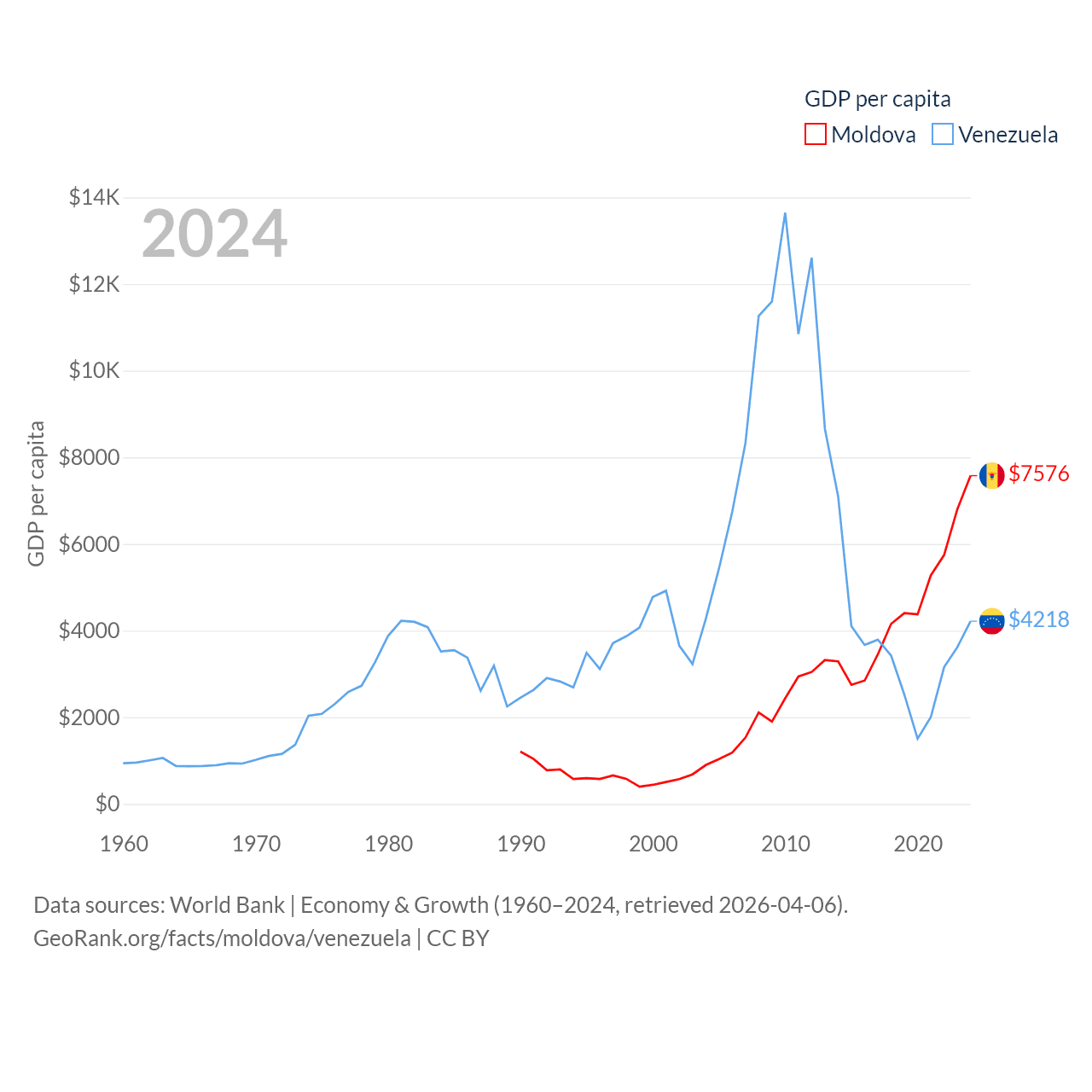 By GDP, Moldova ranks 134/197 ($18.2B) and Venezuela ranks 65/197 ($120B). By GDP per capita, Moldova ranks 99/197 ($7,576), while Venezuela ranks 128/197 ($4,218).