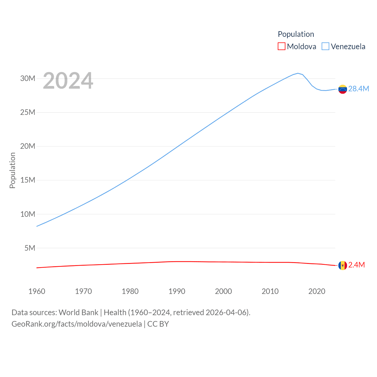 Moldova has a population of 2.4M (ranked 143/197), compared with 28.4M in Venezuela (ranked 53/197). Moldova's land area is 12,714 sq mi versus 340,561 sq mi for Venezuela (ranked 135th vs. 32nd).