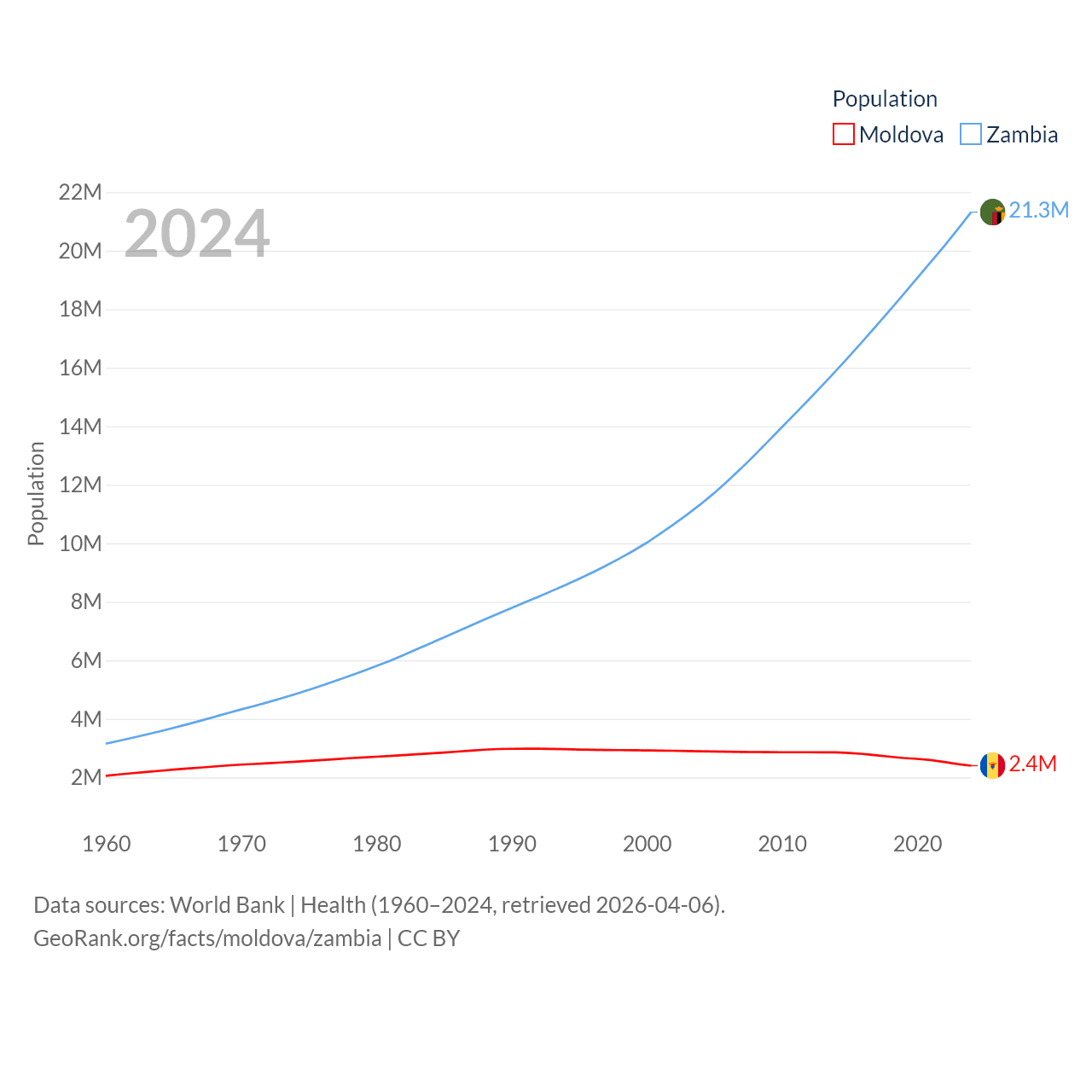 Moldova has a population of 2.4M (ranked 143/197), compared with 21.3M in Zambia (ranked 63/197). Moldova's land area is 12,714 sq mi versus 287,024 sq mi for Zambia (ranked 135th vs. 37th).