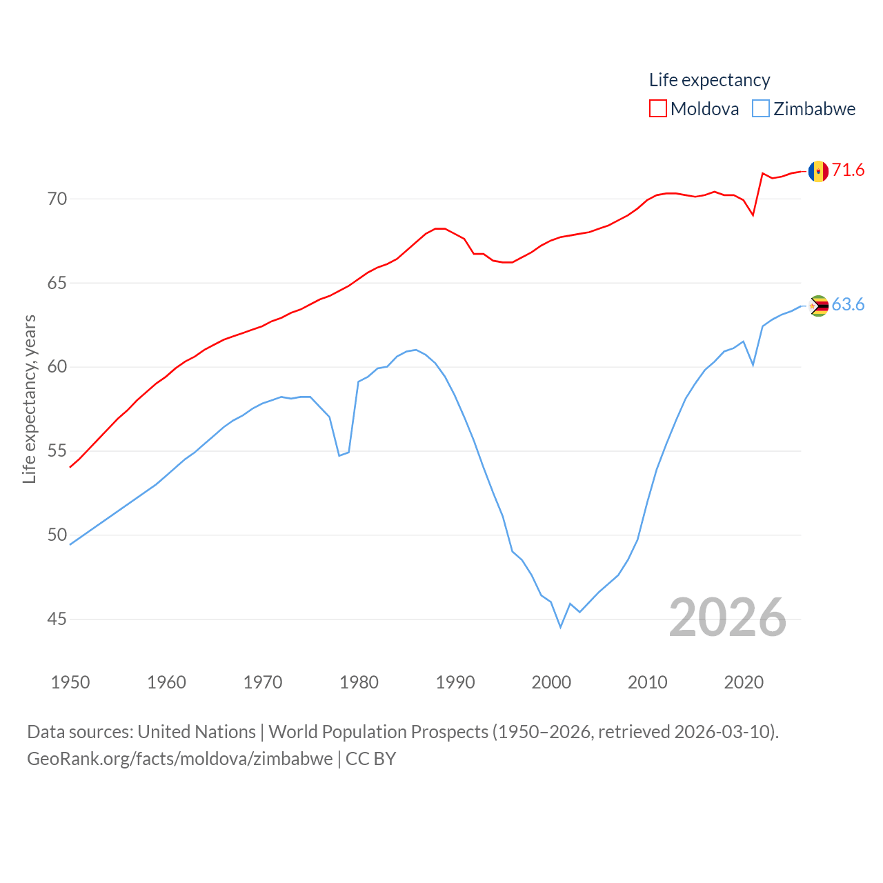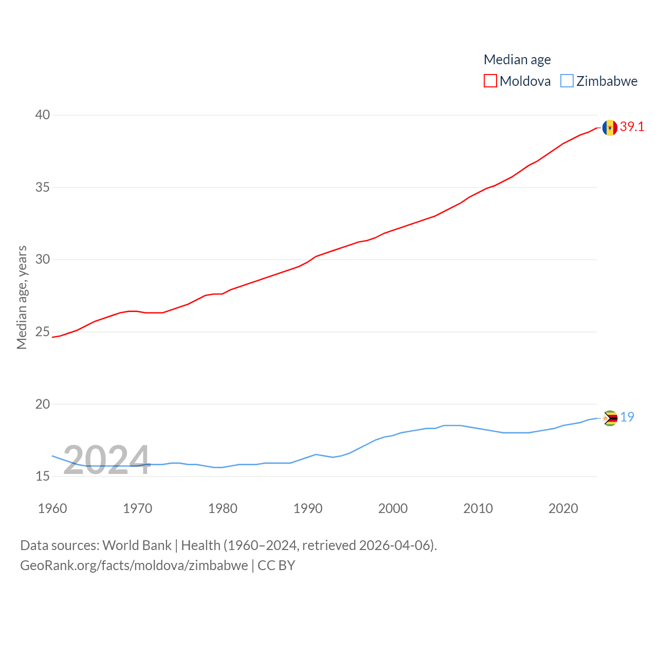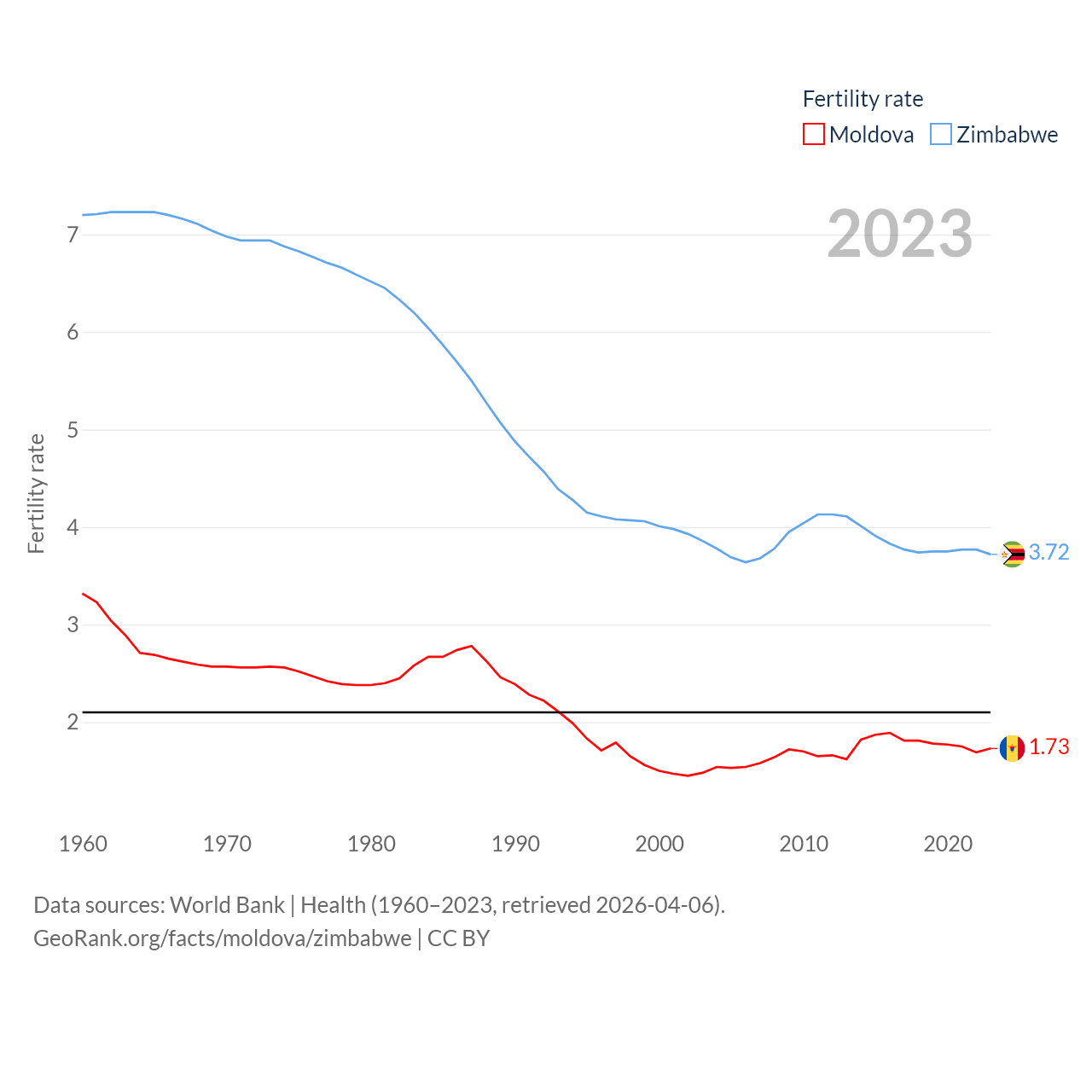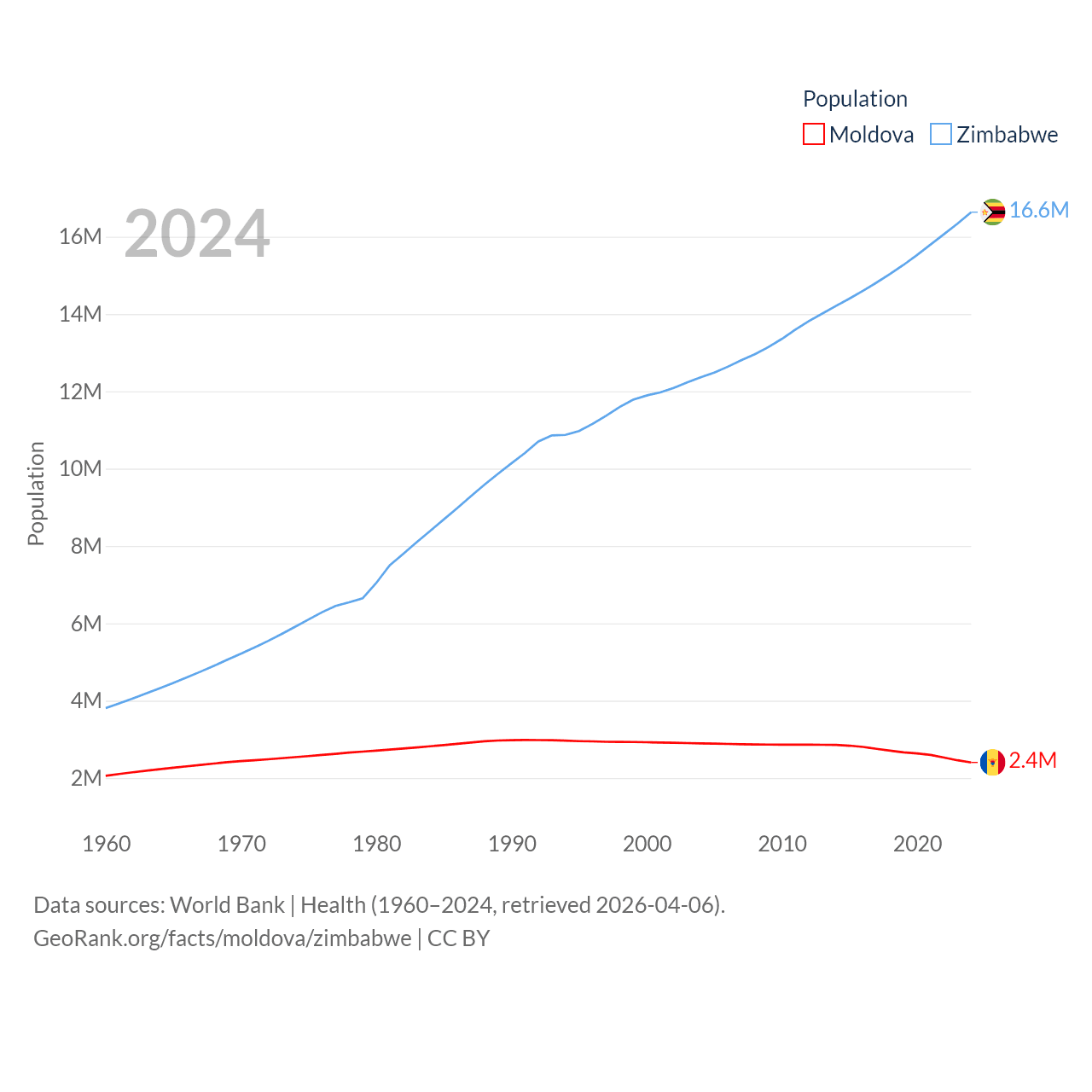 Moldova has a population of 2.4M (ranked 143/197), compared with 16.6M in Zimbabwe (ranked 74/197). Moldova's land area is 12,714 sq mi versus 149,364 sq mi for Zimbabwe (ranked 135th vs. 60th).