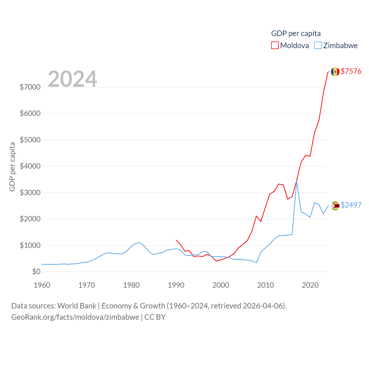 By GDP, Moldova ranks 134/197 ($18.2B) and Zimbabwe ranks 102/197 ($41.5B). By GDP per capita, Moldova ranks 99/197 ($7,576), while Zimbabwe ranks 148/197 ($2,497).
