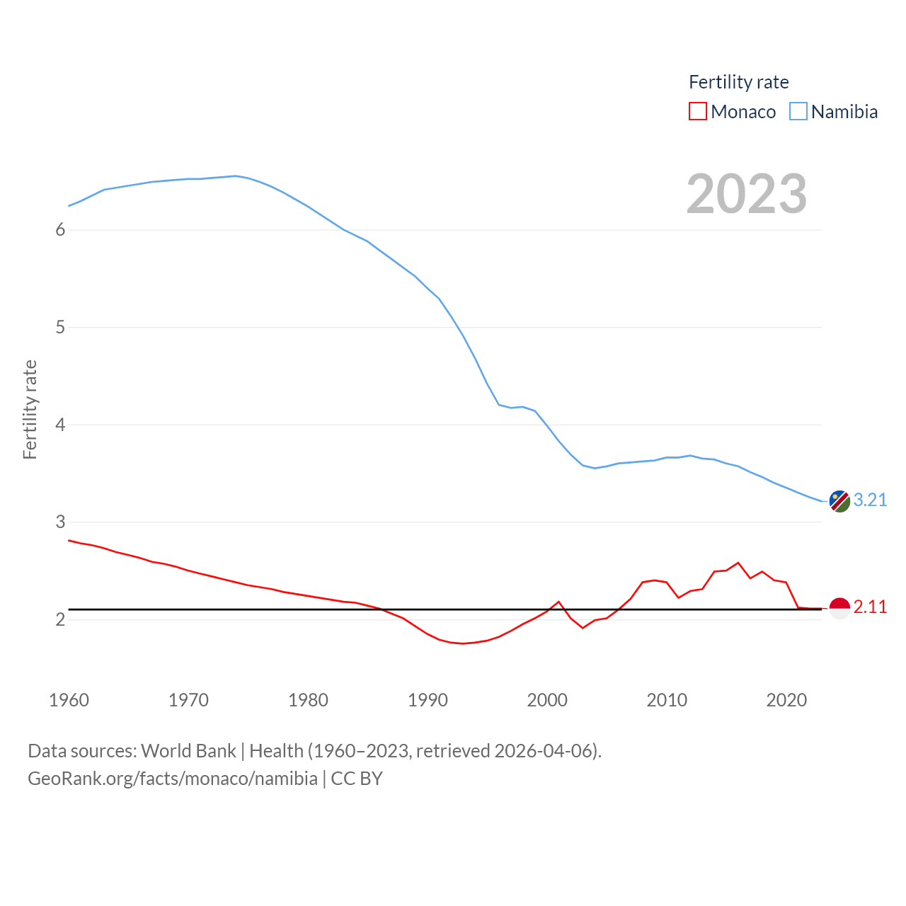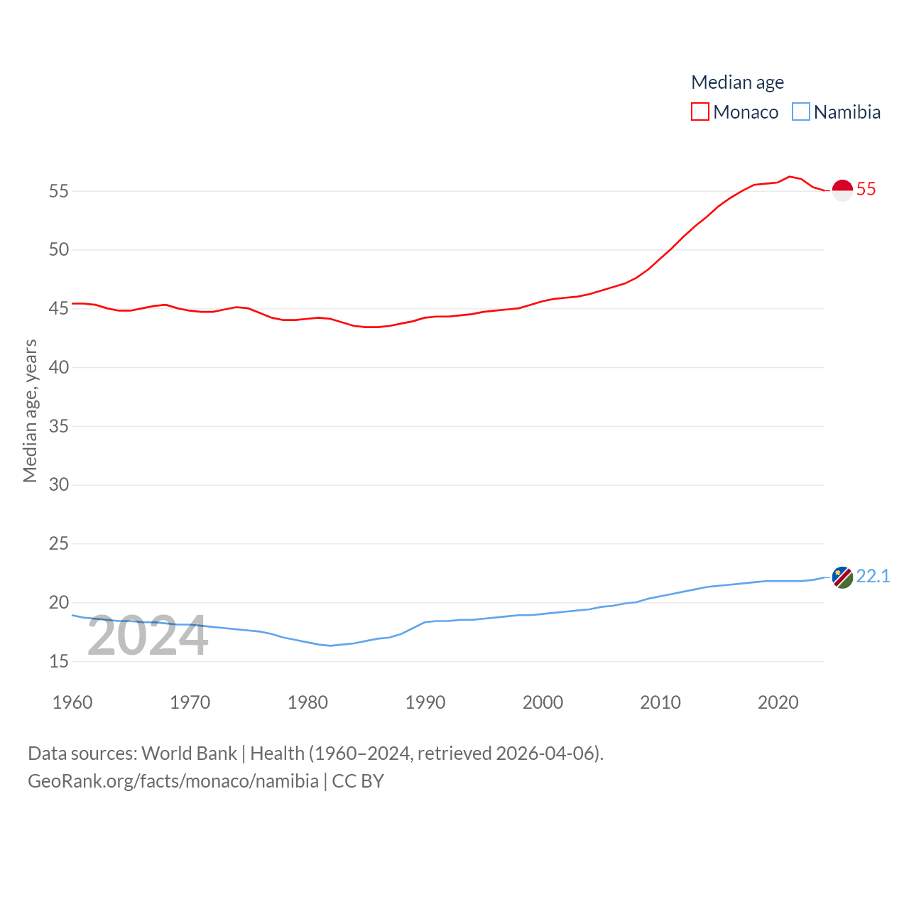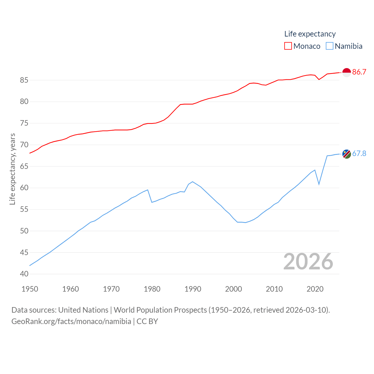 Monaco has a population of 38.6K (ranked 191/197), compared with 3.03M in Namibia (ranked 136/197). Monaco's land area is 0.8 sq mi versus 317,874 sq mi for Namibia (ranked 196th vs. 33rd).