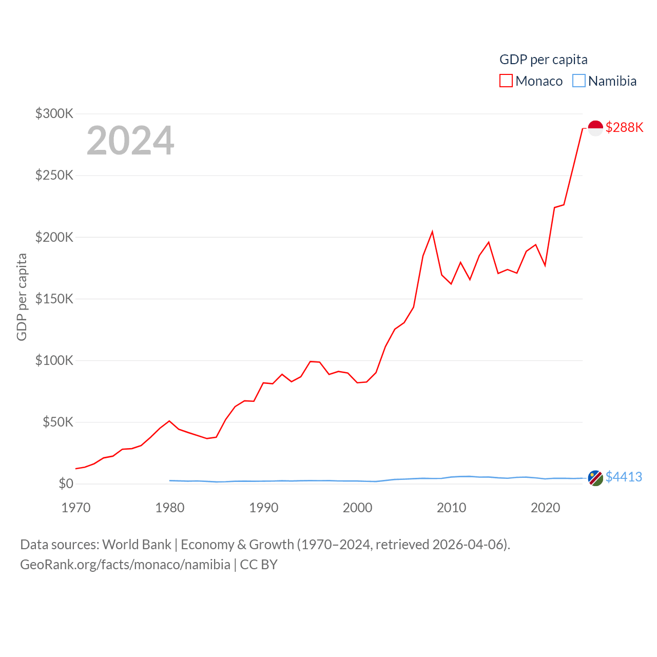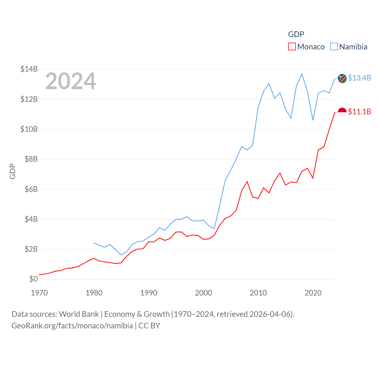 By GDP, Monaco ranks 152/197 ($11.1B) and Namibia ranks 147/197 ($13.4B). By GDP per capita, Monaco ranks 1/197 ($288,001), while Namibia ranks 126/197 ($4,413).