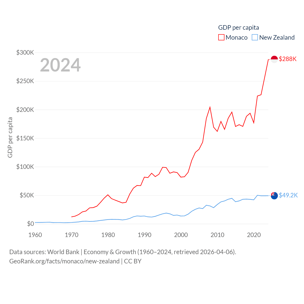 By GDP, Monaco ranks 152/197 ($11.1B) and New Zealand ranks 52/197 ($260B). By GDP per capita, Monaco ranks 1/197 ($288,001), while New Zealand ranks 26/197 ($49,205).