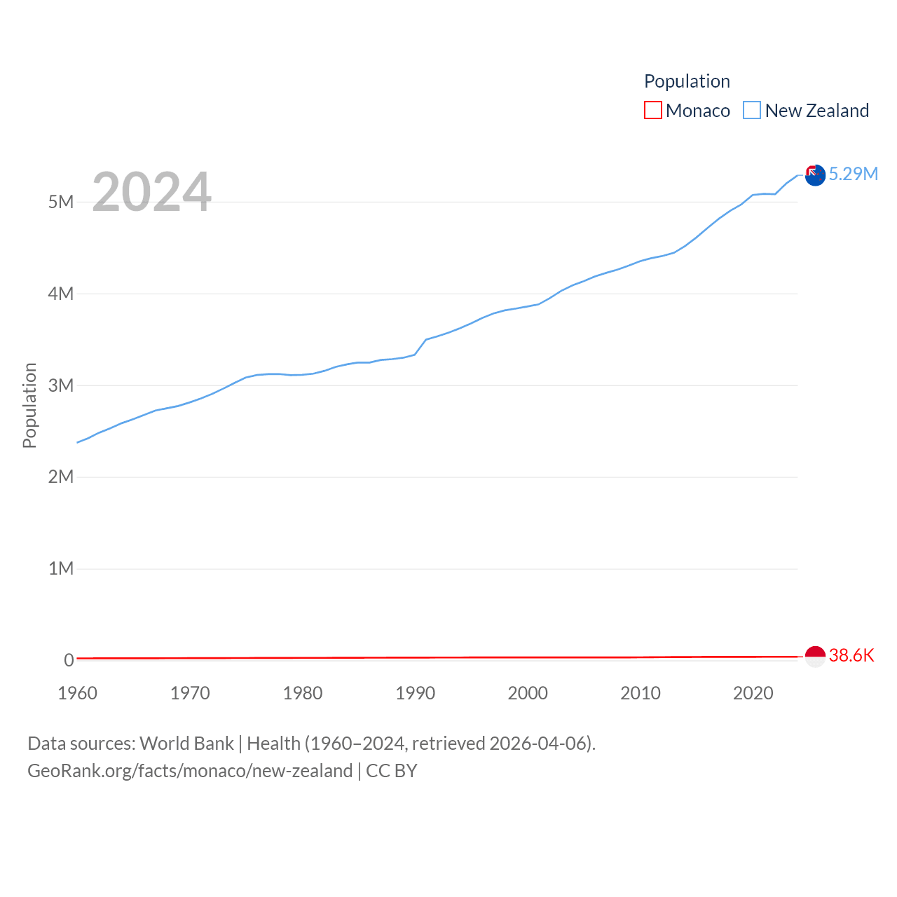 Monaco has a population of 38.6K (ranked 191/197), compared with 5.29M in New Zealand (ranked 123/197). Monaco's land area is 0.8 sq mi versus 101,665 sq mi for New Zealand (ranked 196th vs. 74th).