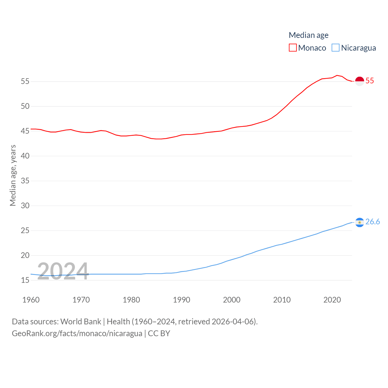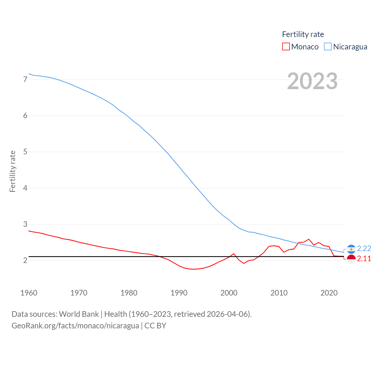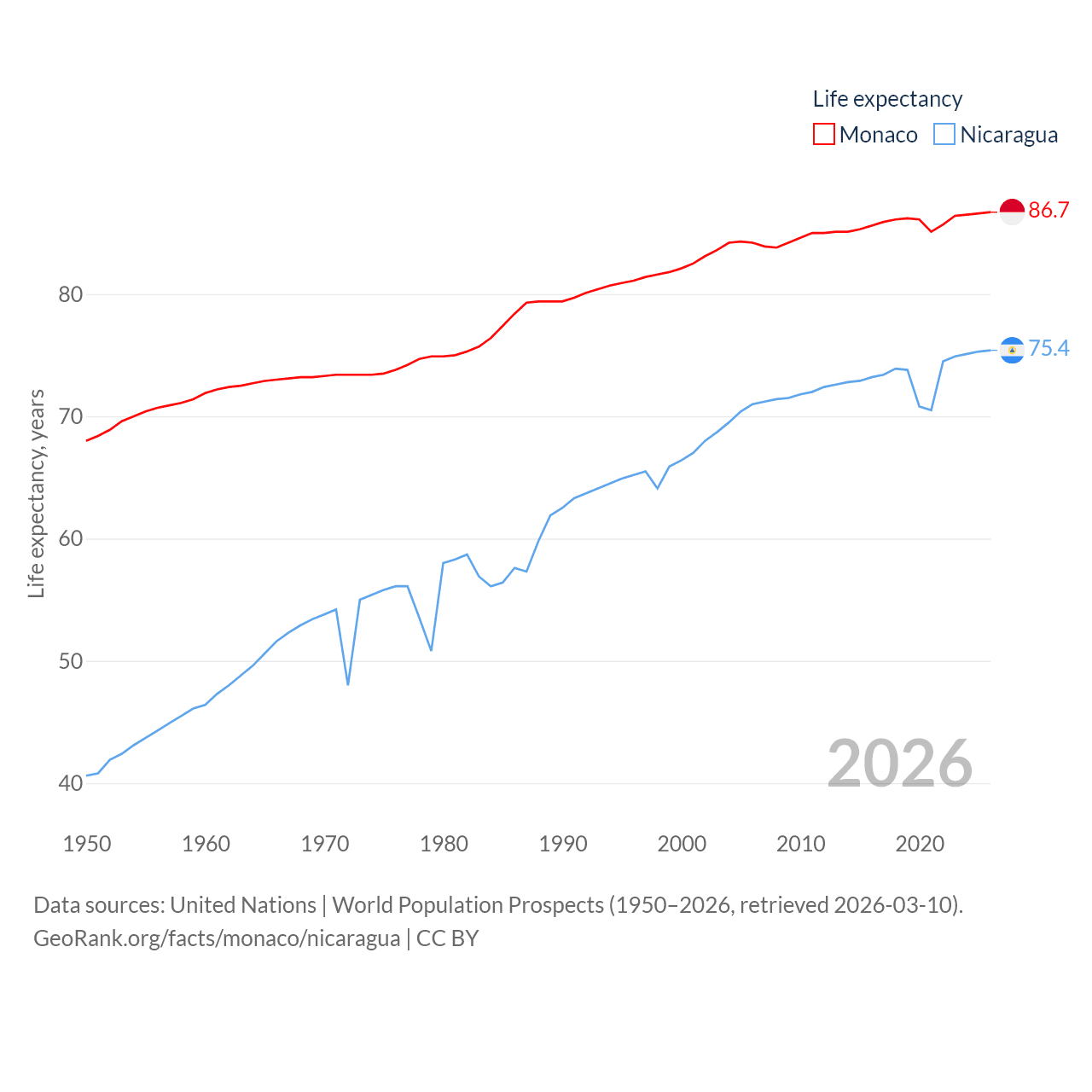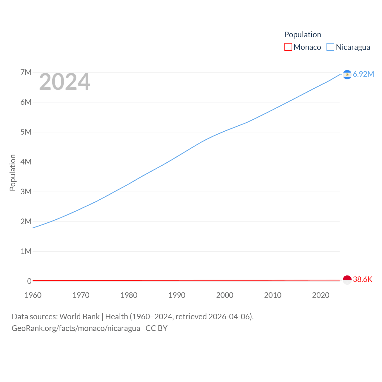 Monaco has a population of 38.6K (ranked 191/197), compared with 6.92M in Nicaragua (ranked 108/197). Monaco's land area is 0.8 sq mi versus 46,464 sq mi for Nicaragua (ranked 196th vs. 98th).