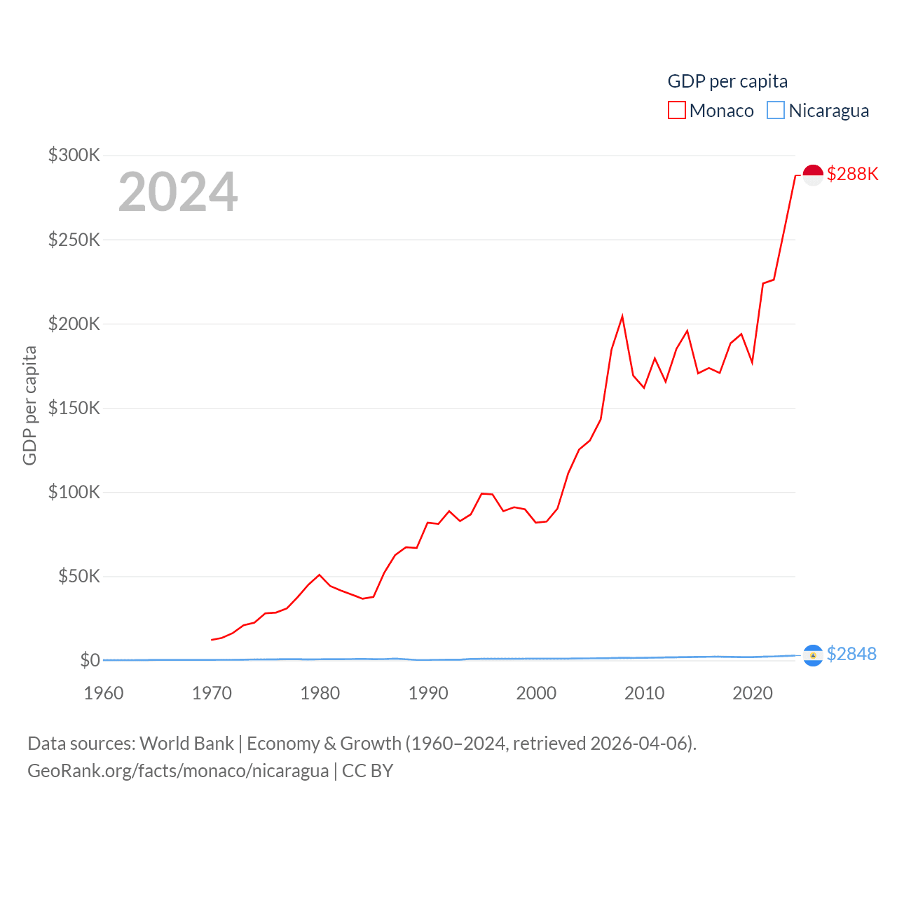 By GDP, Monaco ranks 152/197 ($11.1B) and Nicaragua ranks 131/197 ($19.7B). By GDP per capita, Monaco ranks 1/197 ($288,001), while Nicaragua ranks 141/197 ($2,848).