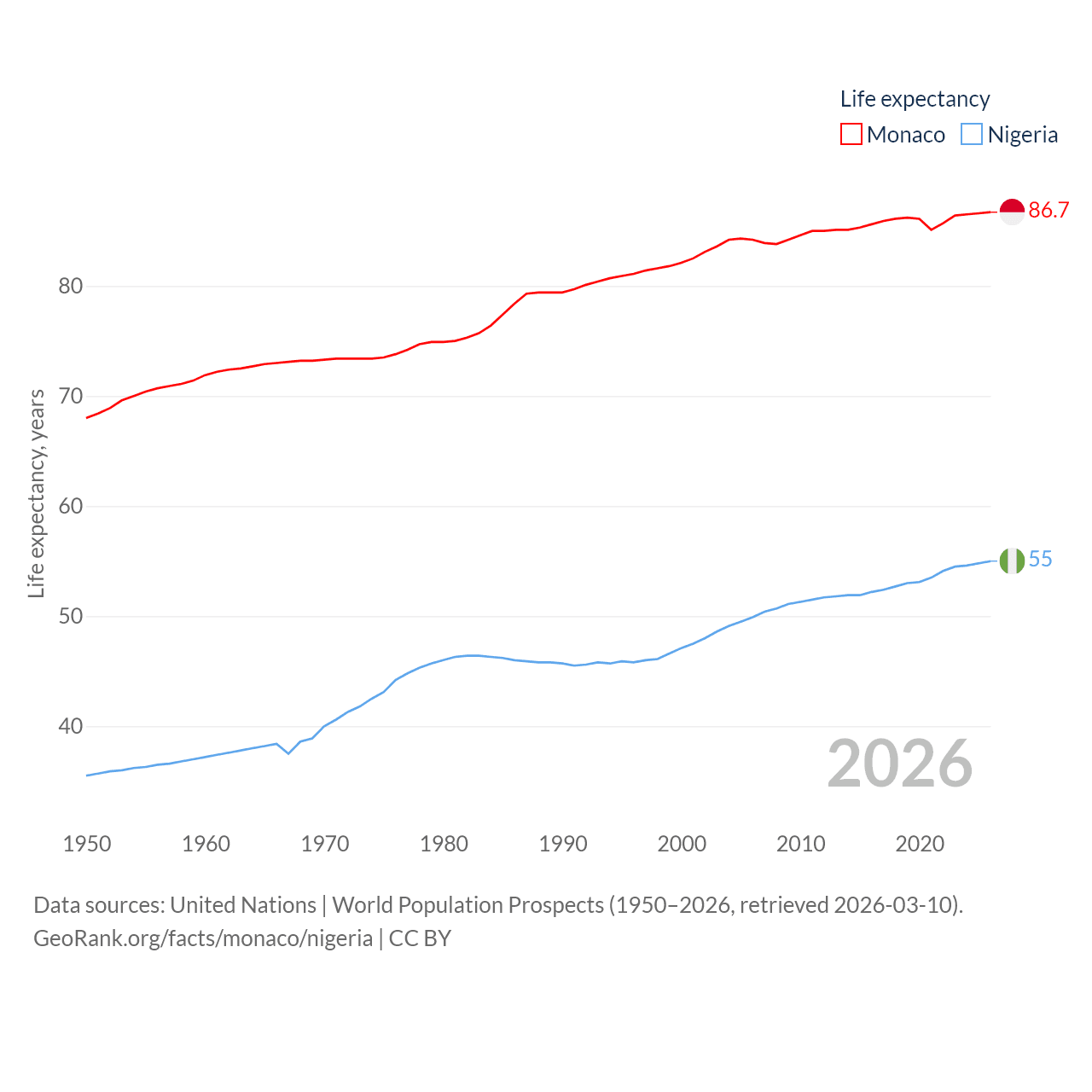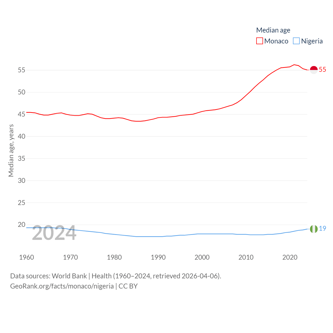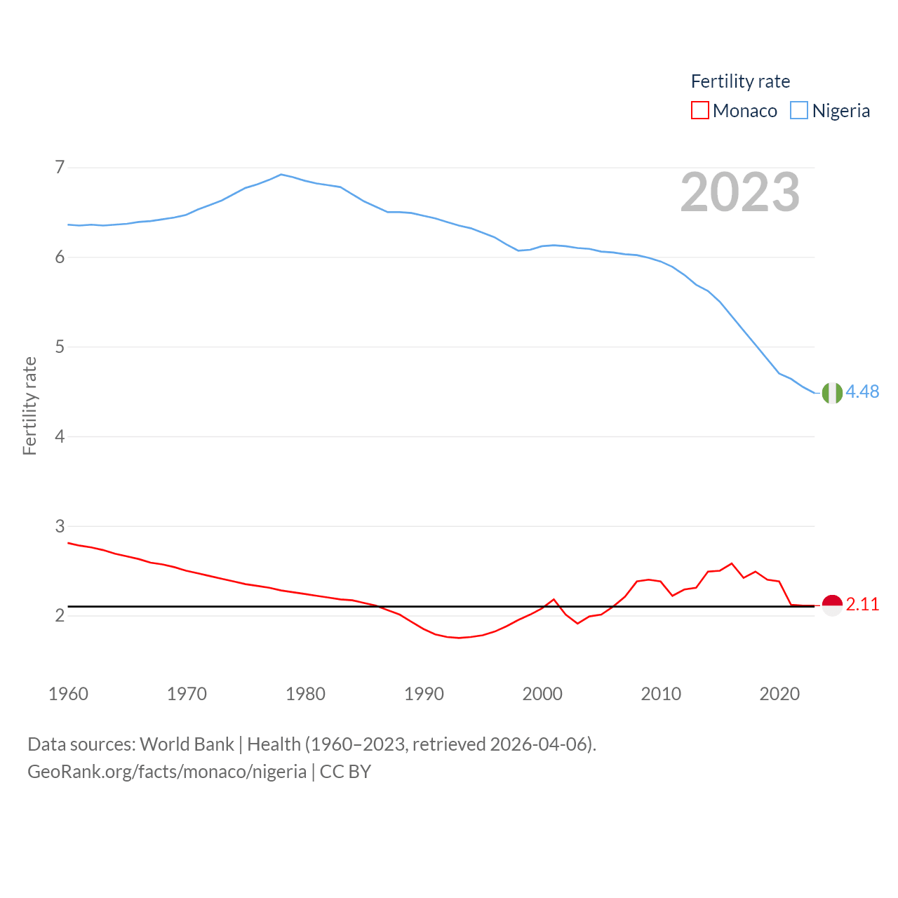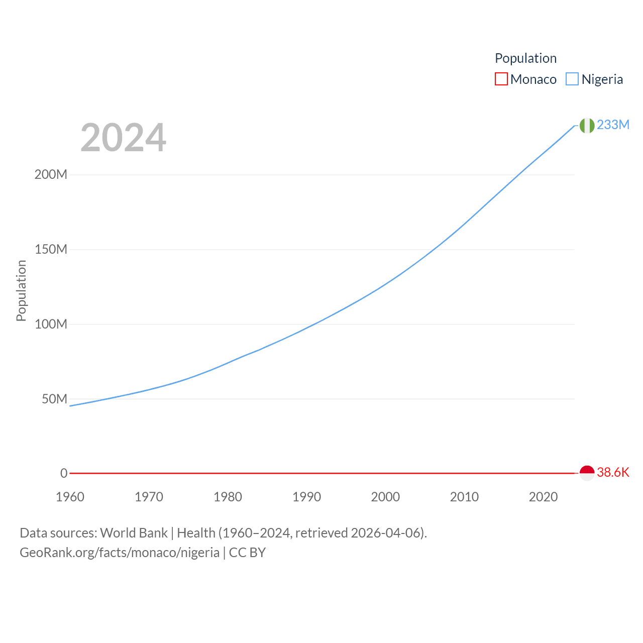 Monaco has a population of 38.6K (ranked 191/197), compared with 233M in Nigeria (ranked 6/197). Monaco's land area is 0.8 sq mi versus 351,650 sq mi for Nigeria (ranked 196th vs. 30th).