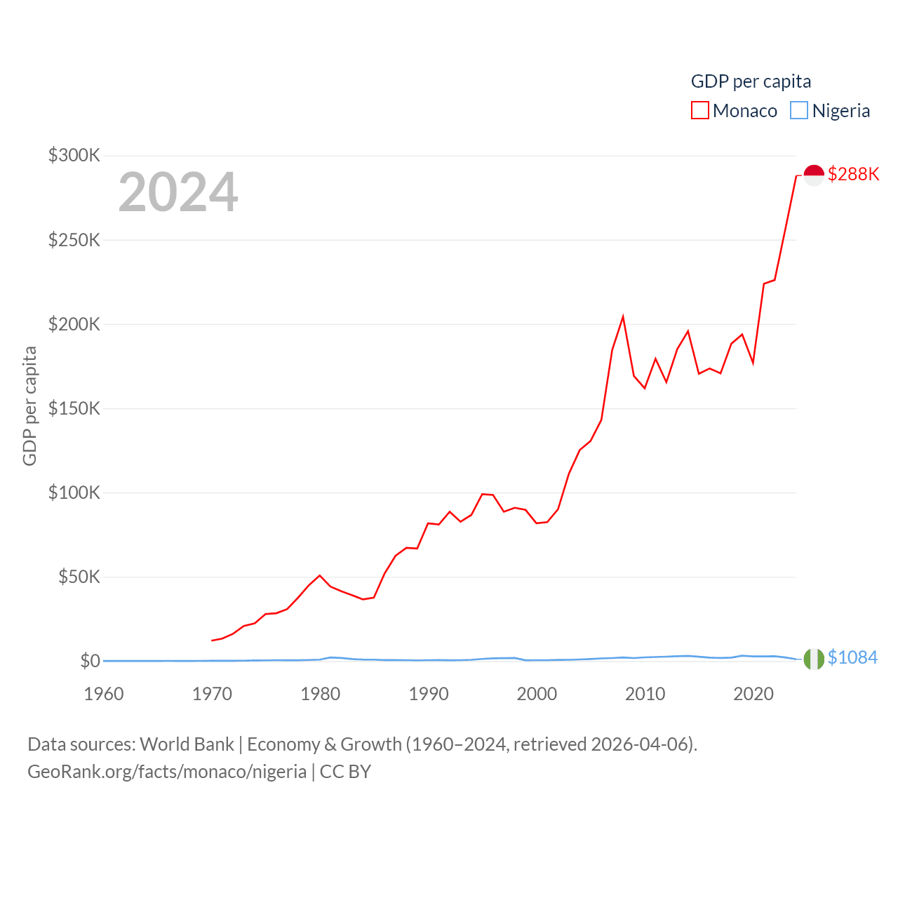 By GDP, Monaco ranks 152/197 ($11.1B) and Nigeria ranks 54/197 ($252B). By GDP per capita, Monaco ranks 1/197 ($288,001), while Nigeria ranks 174/197 ($1,084).