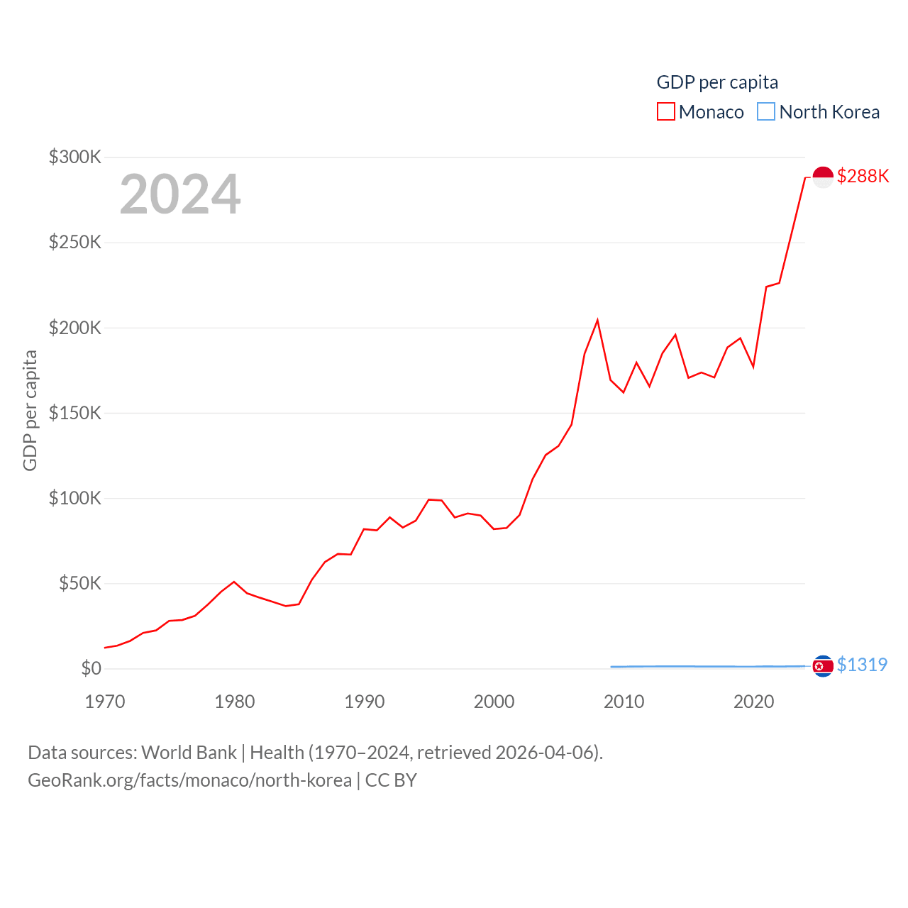 By GDP, Monaco ranks 152/197 ($11.1B) and North Korea ranks 106/197 ($34.9B). By GDP per capita, Monaco ranks 1/197 ($288,001), while North Korea ranks 168/197 ($1,319).