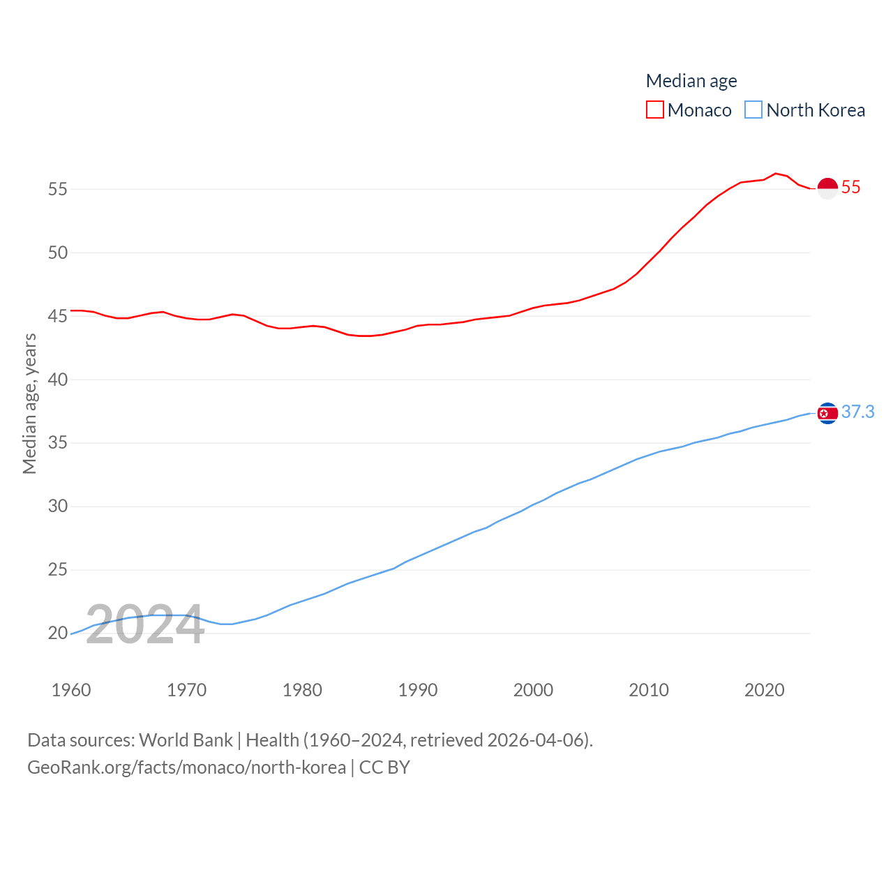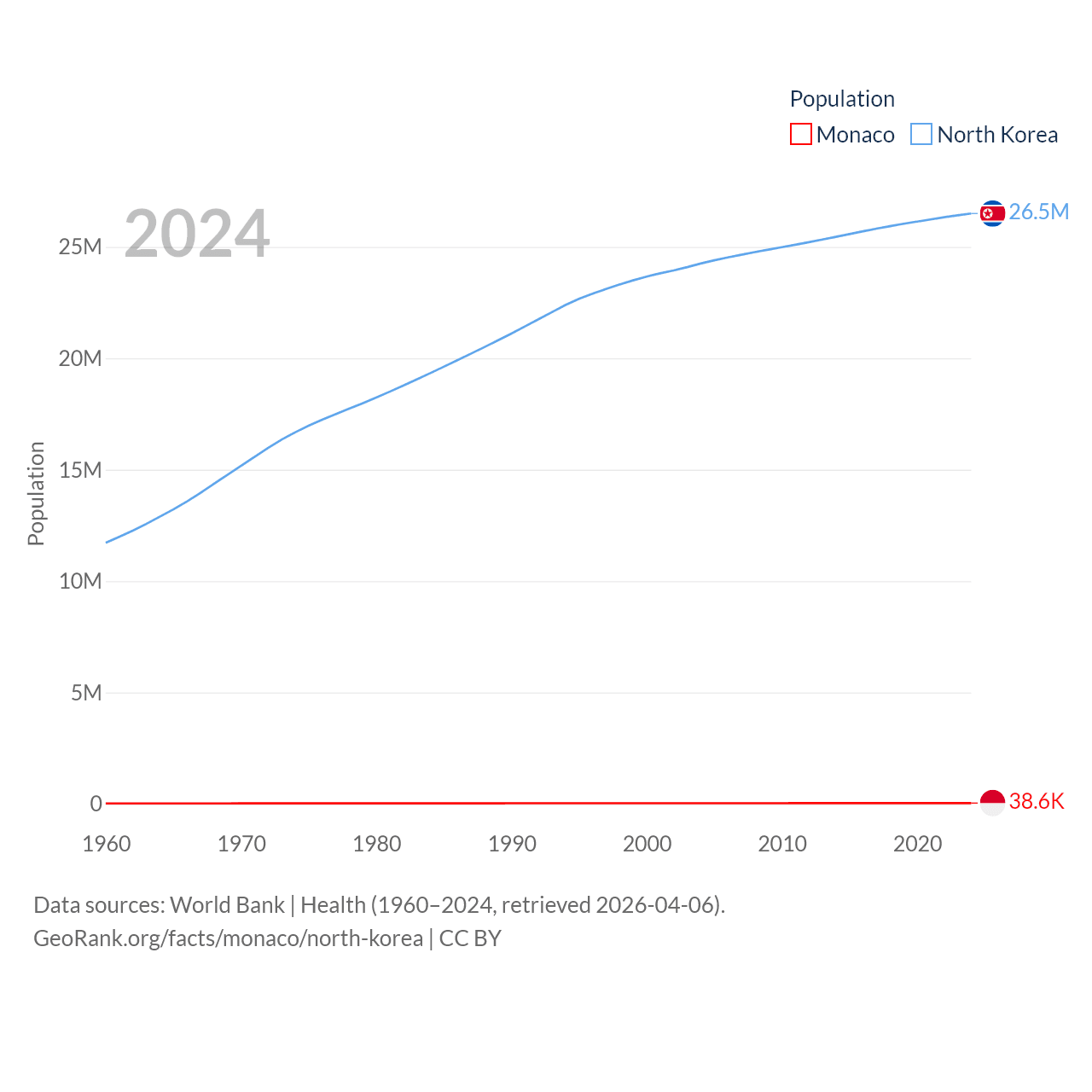 Monaco has a population of 38.6K (ranked 191/197), compared with 26.5M in North Korea (ranked 56/197). Monaco's land area is 0.8 sq mi versus 46,491 sq mi for North Korea (ranked 196th vs. 97th).