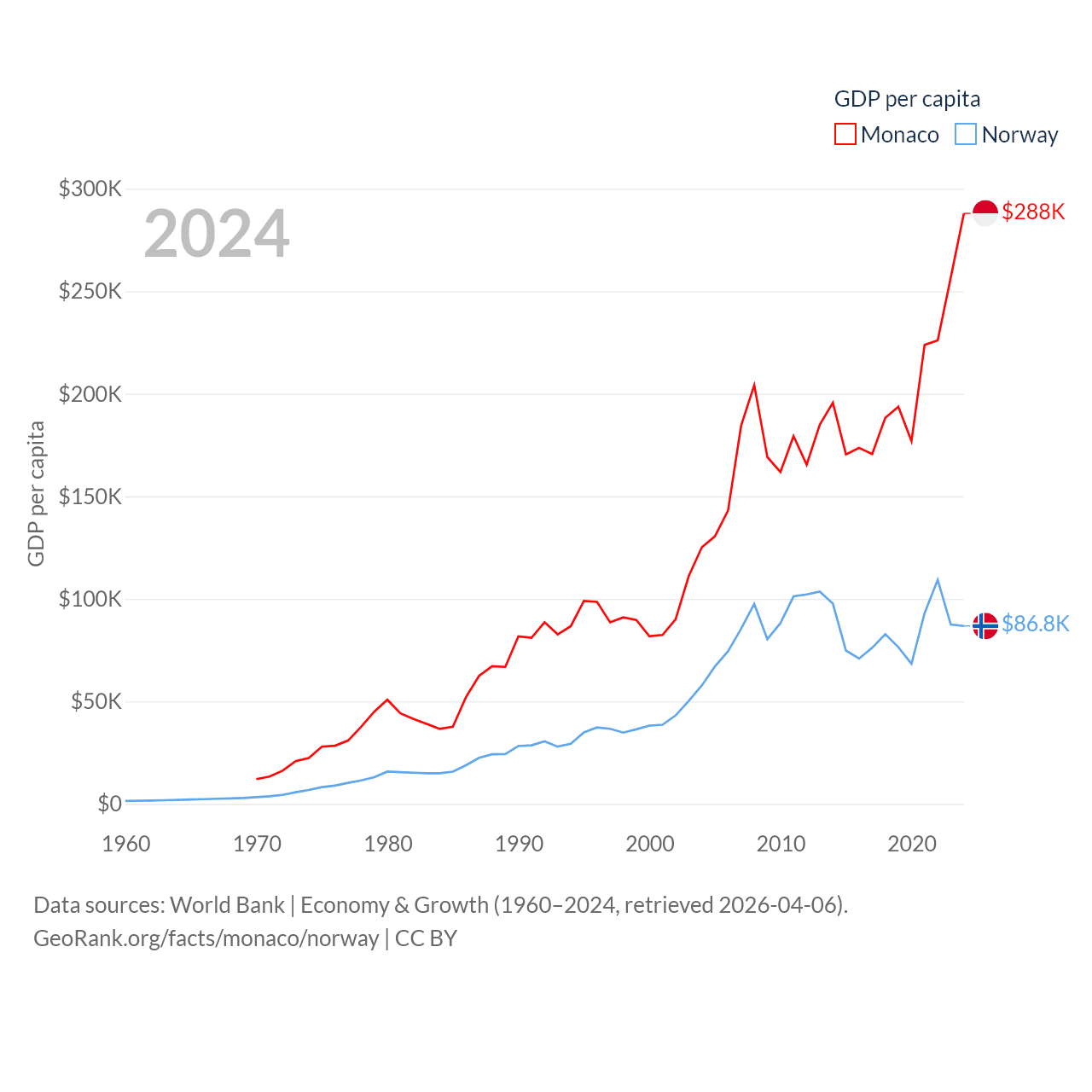 By GDP, Monaco ranks 152/197 ($11.1B) and Norway ranks 32/197 ($484B). By GDP per capita, Monaco ranks 1/197 ($288,001), while Norway ranks 8/197 ($86,785).