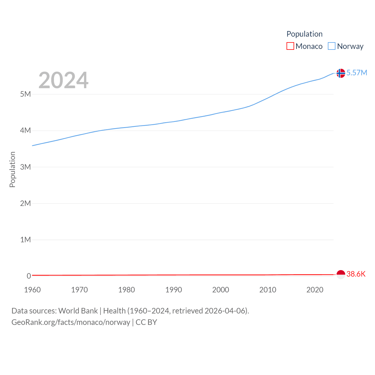 Monaco has a population of 38.6K (ranked 191/197), compared with 5.57M in Norway (ranked 118/197). Monaco's land area is 0.8 sq mi versus 140,645 sq mi for Norway (ranked 196th vs. 62nd).