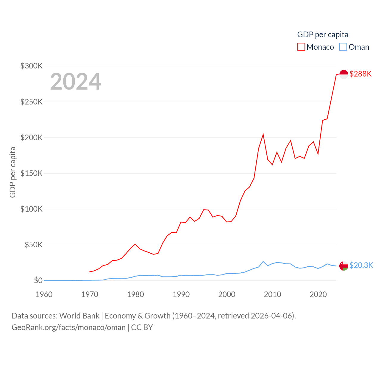 By GDP, Monaco ranks 152/197 ($11.1B) and Oman ranks 70/197 ($107B). By GDP per capita, Monaco ranks 1/197 ($288,001), while Oman ranks 57/197 ($20,285).