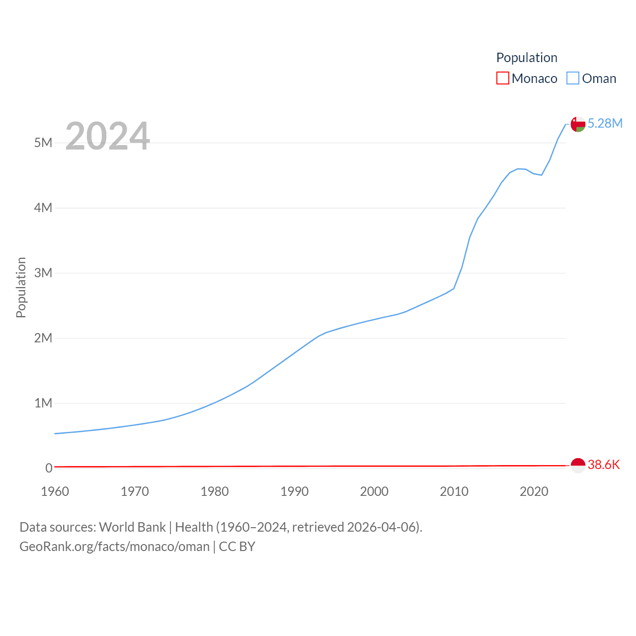 Monaco has a population of 38.6K (ranked 191/197), compared with 5.28M in Oman (ranked 124/197). Monaco's land area is 0.8 sq mi versus 119,499 sq mi for Oman (ranked 196th vs. 68th).
