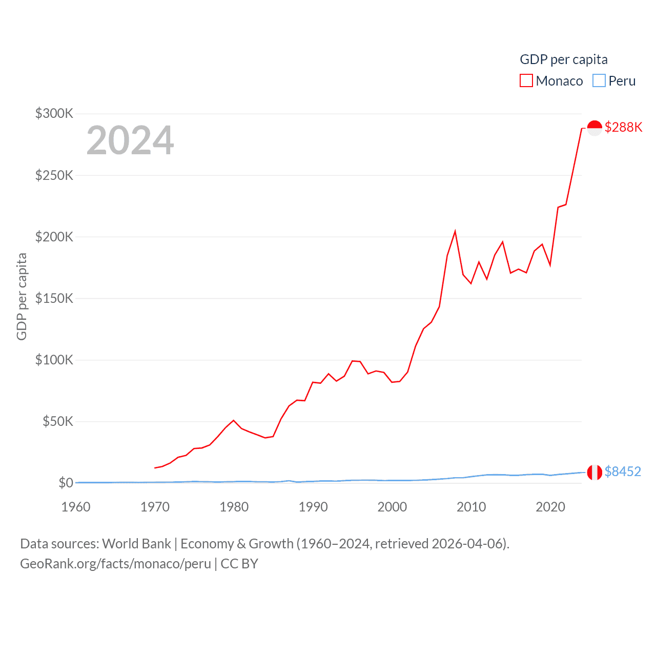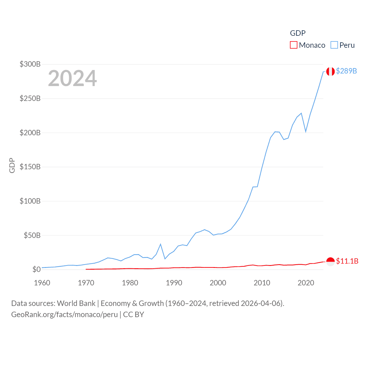 By GDP, Monaco ranks 152/197 ($11.1B) and Peru ranks 49/197 ($289B). By GDP per capita, Monaco ranks 1/197 ($288,001), while Peru ranks 91/197 ($8,452).