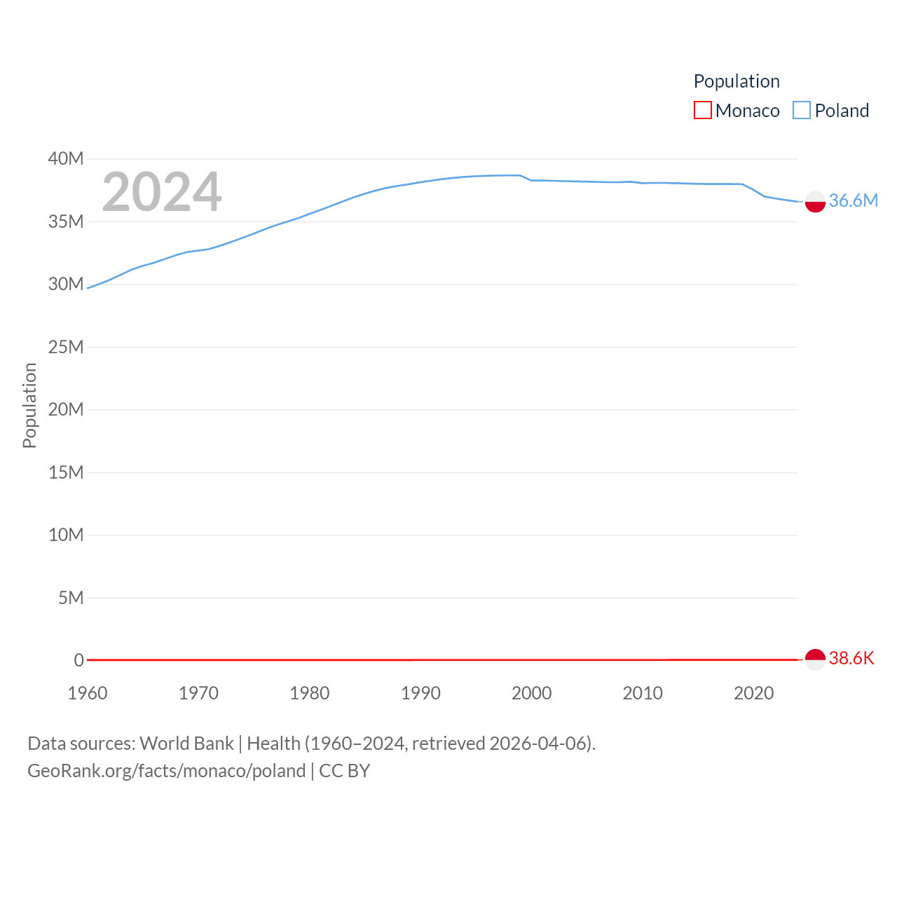 Monaco has a population of 38.6K (ranked 191/197), compared with 36.6M in Poland (ranked 42/197). Monaco's land area is 0.8 sq mi versus 118,252 sq mi for Poland (ranked 196th vs. 69th).