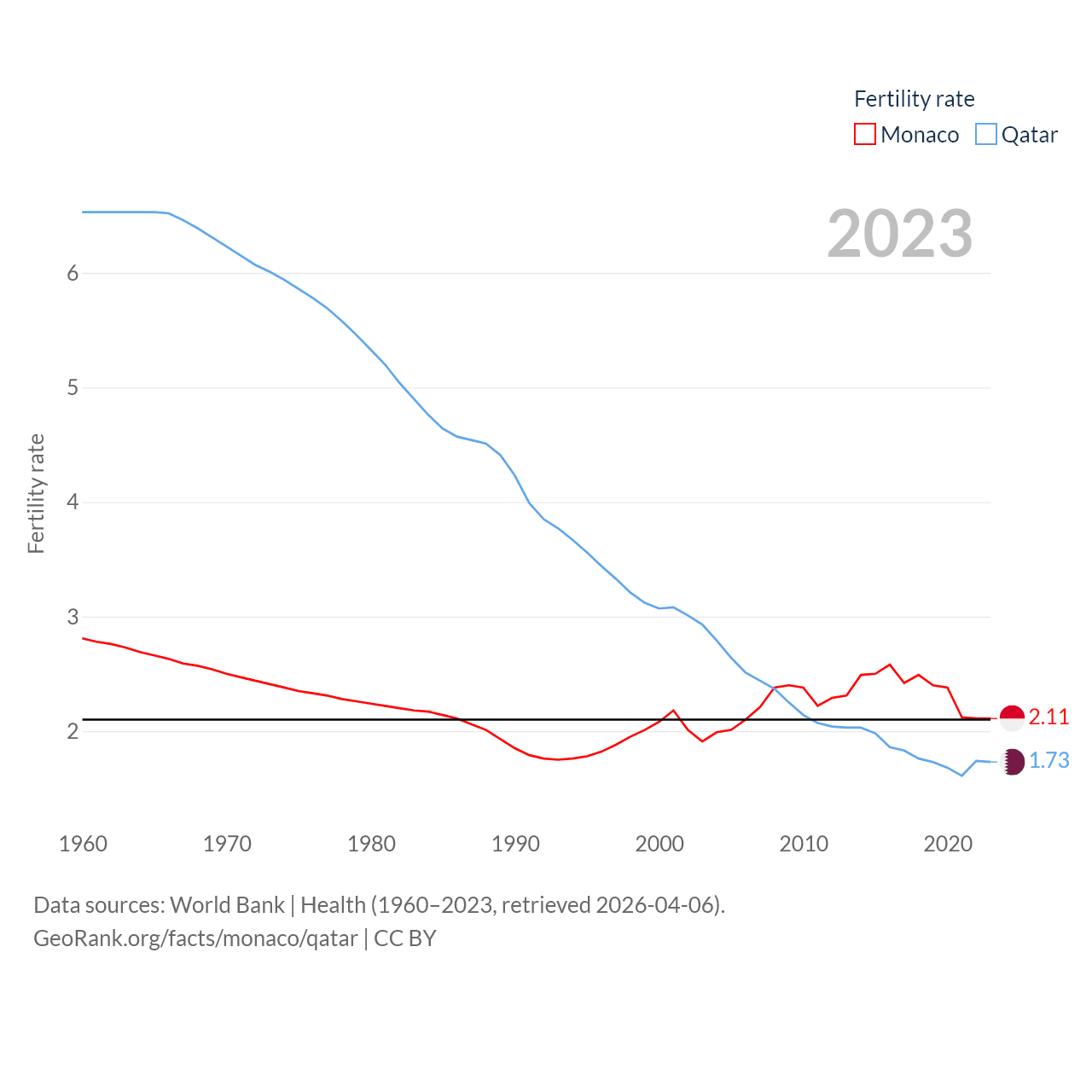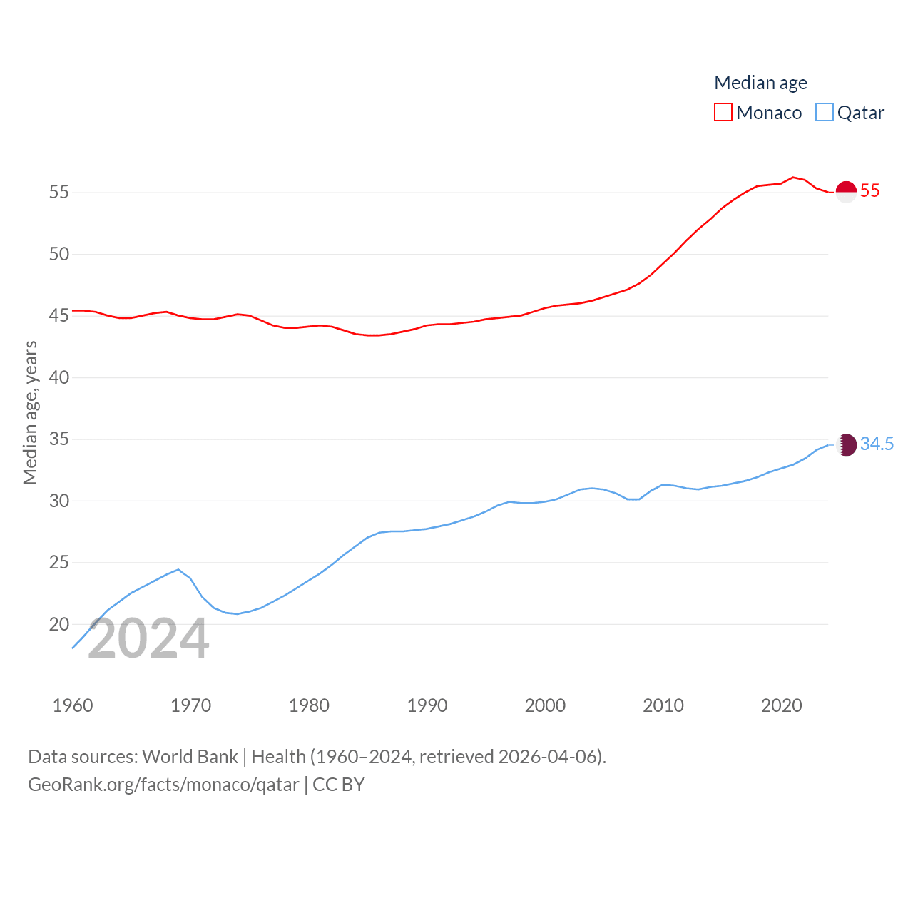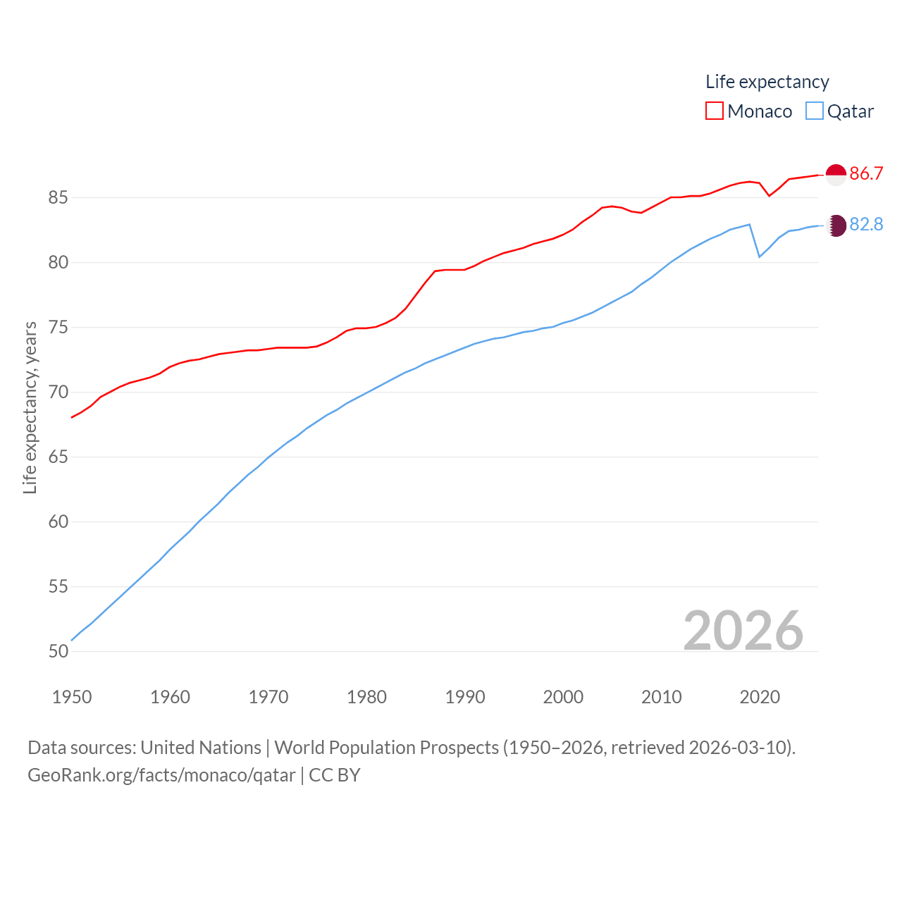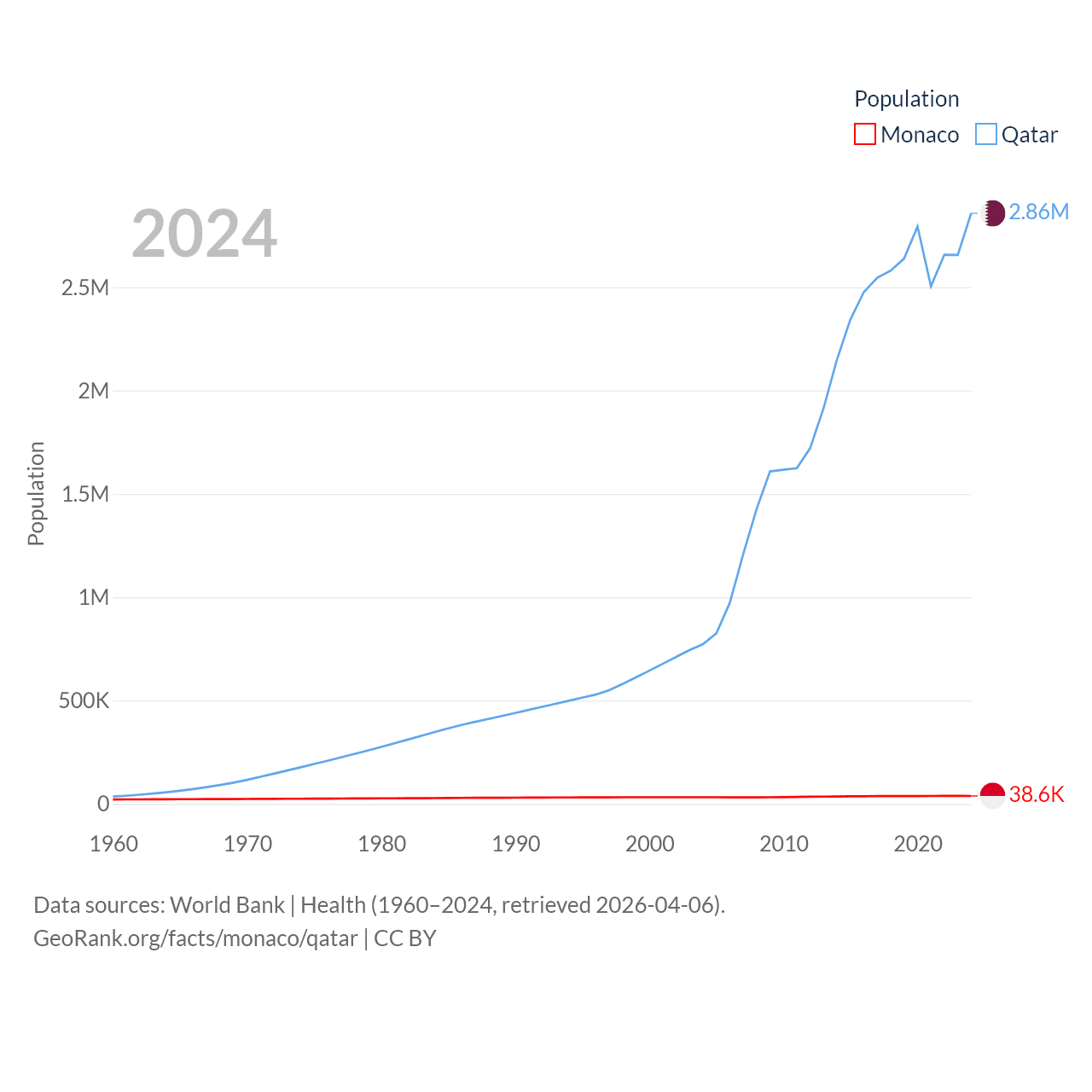 Monaco has a population of 38.6K (ranked 191/197), compared with 2.86M in Qatar (ranked 138/197). Monaco's land area is 0.8 sq mi versus 4,436 sq mi for Qatar (ranked 196th vs. 158th).