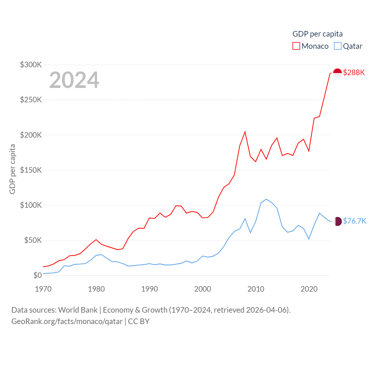 By GDP, Monaco ranks 152/197 ($11.1B) and Qatar ranks 56/197 ($219B). By GDP per capita, Monaco ranks 1/197 ($288,001), while Qatar ranks 11/197 ($76,689).