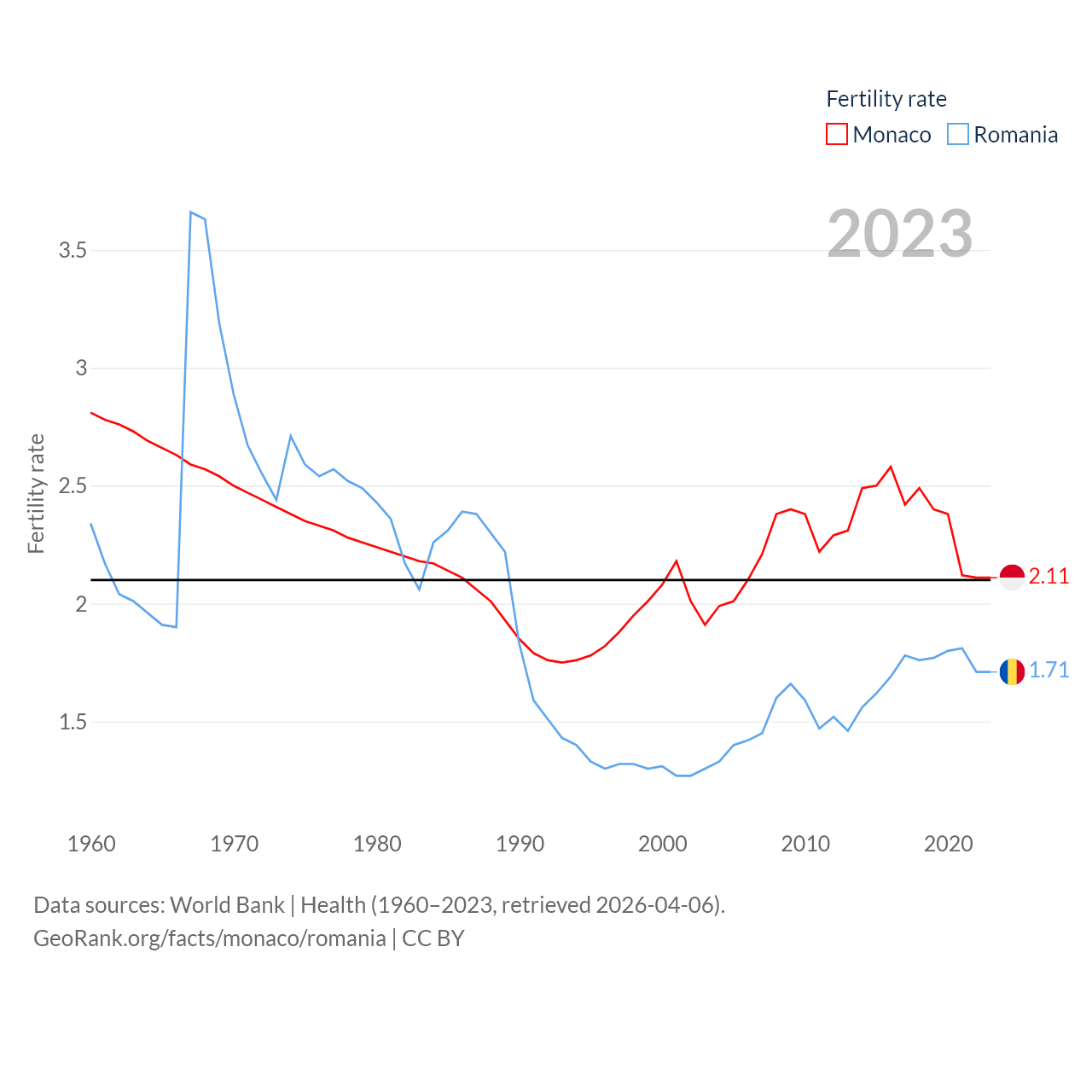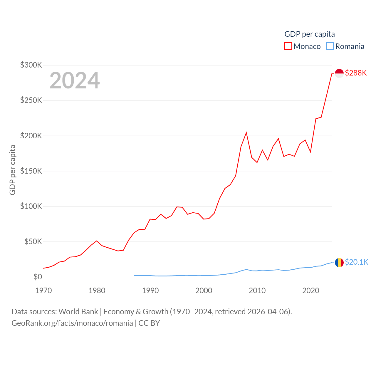 By GDP, Monaco ranks 152/197 ($11.1B) and Romania ranks 42/197 ($383B). By GDP per capita, Monaco ranks 1/197 ($288,001), while Romania ranks 58/197 ($20,080).