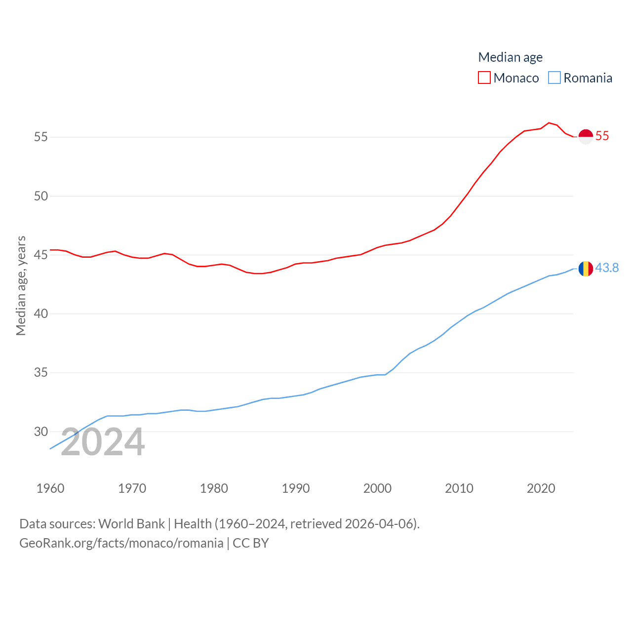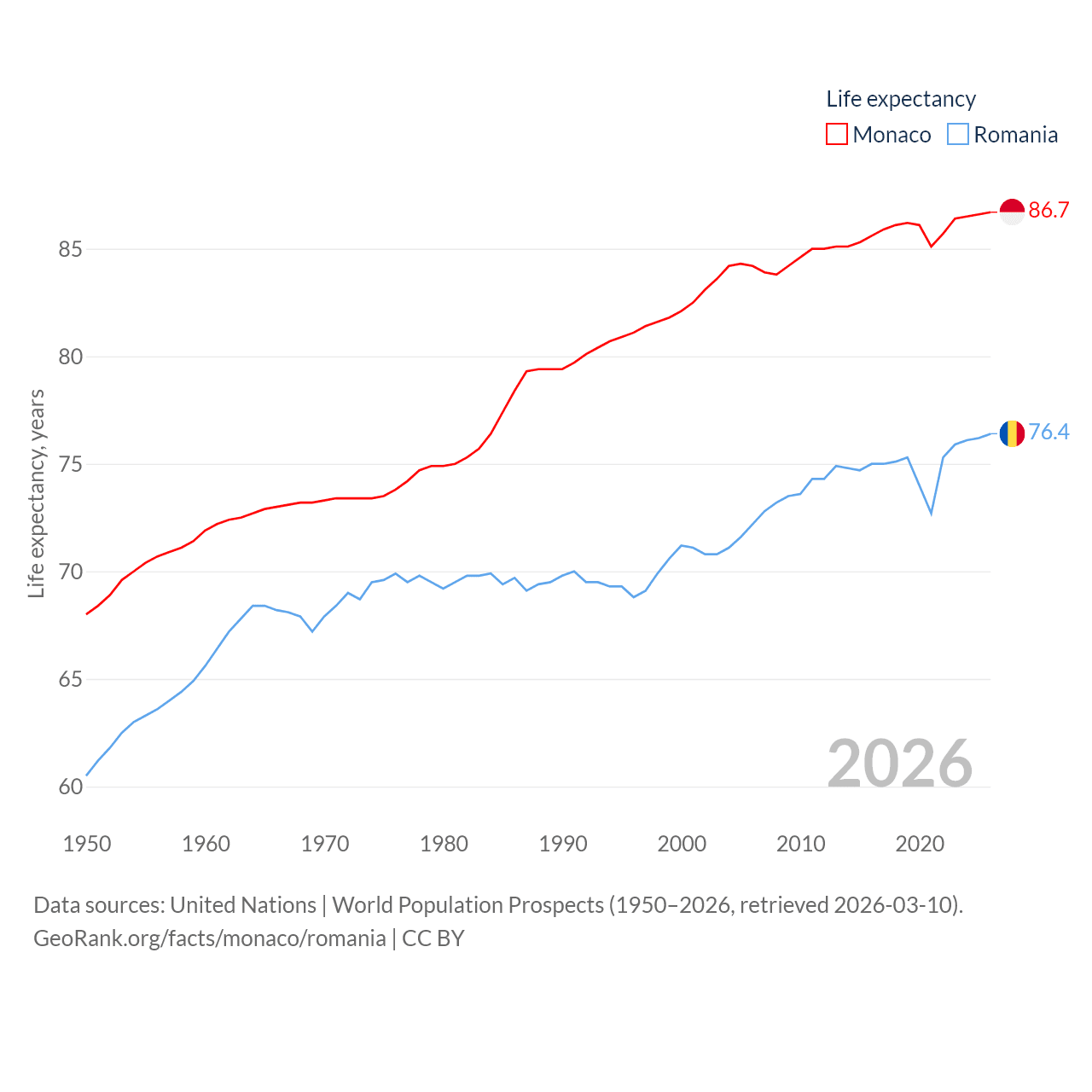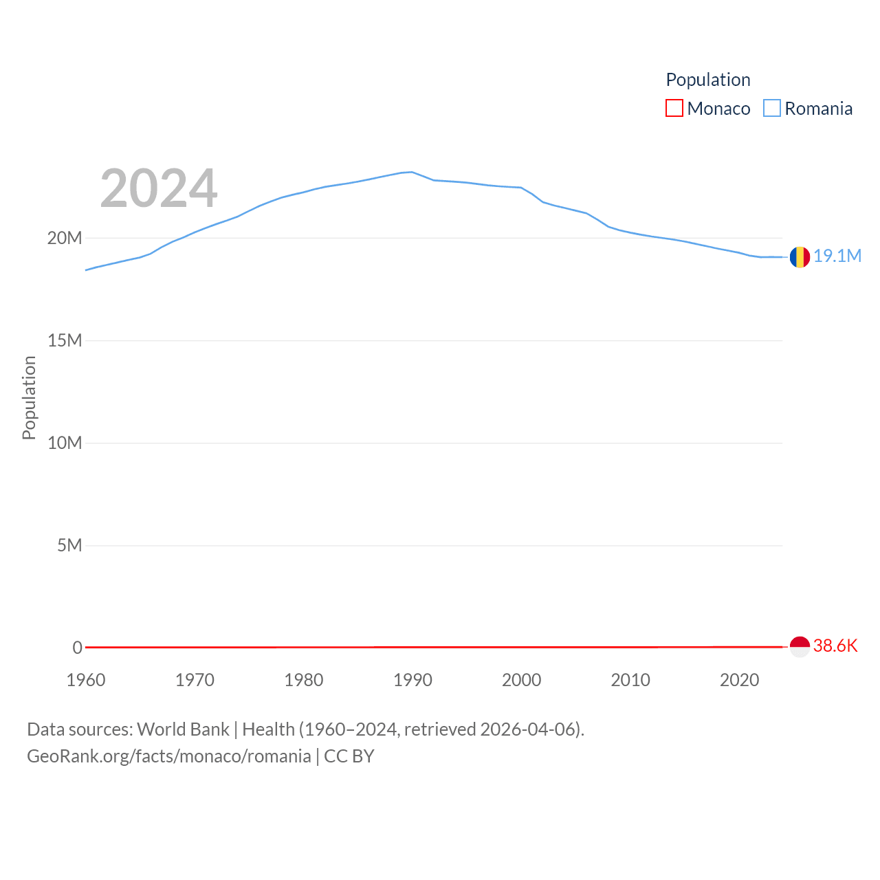 Monaco has a population of 38.6K (ranked 191/197), compared with 19.1M in Romania (ranked 67/197). Monaco's land area is 0.8 sq mi versus 88,834 sq mi for Romania (ranked 196th vs. 80th).