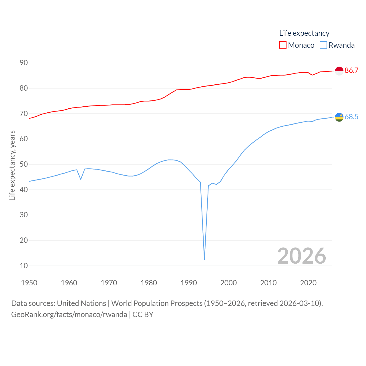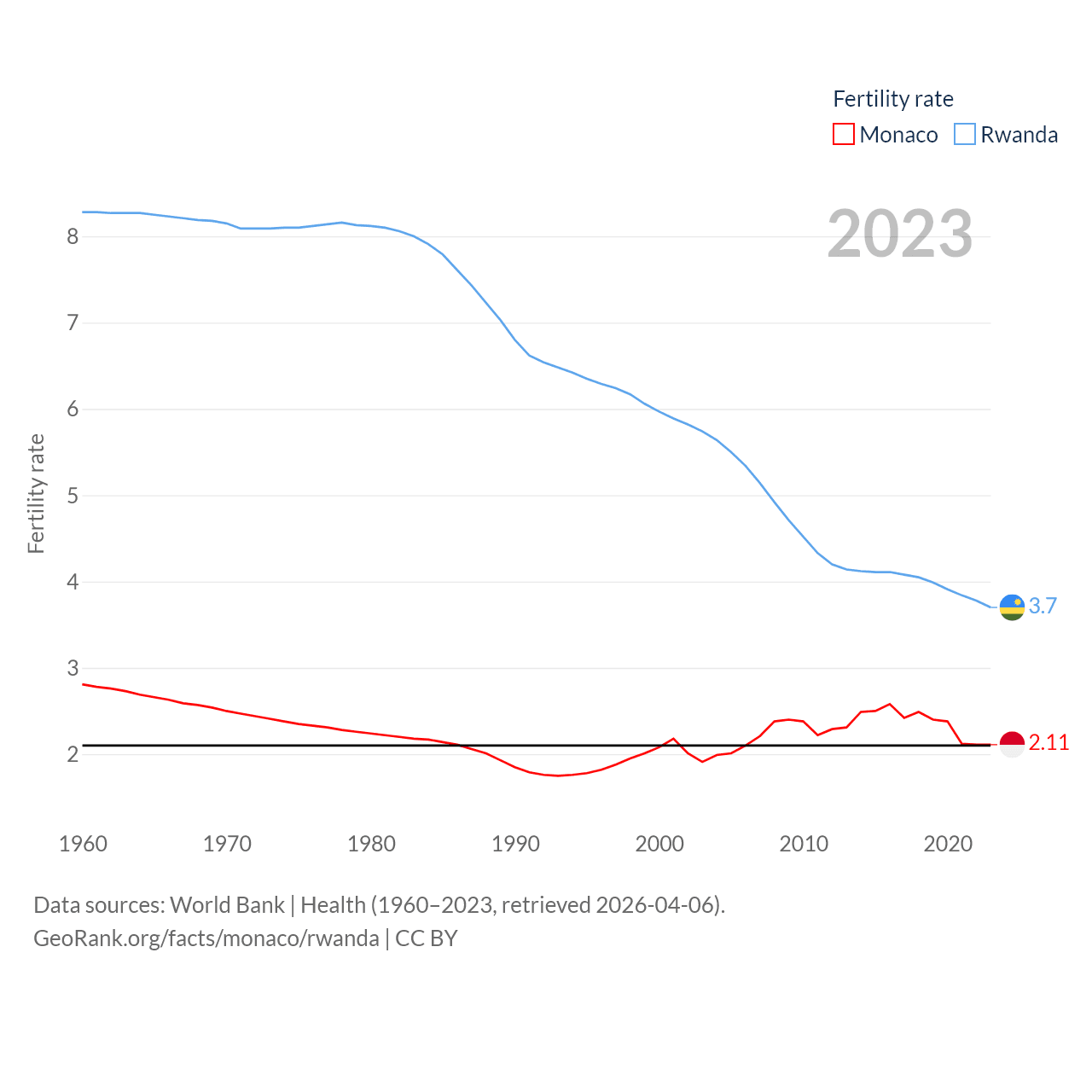 Monaco has a population of 38.6K (ranked 191/197), compared with 14.3M in Rwanda (ranked 77/197). Monaco's land area is 0.8 sq mi versus 9,525 sq mi for Rwanda (ranked 196th vs. 146th).