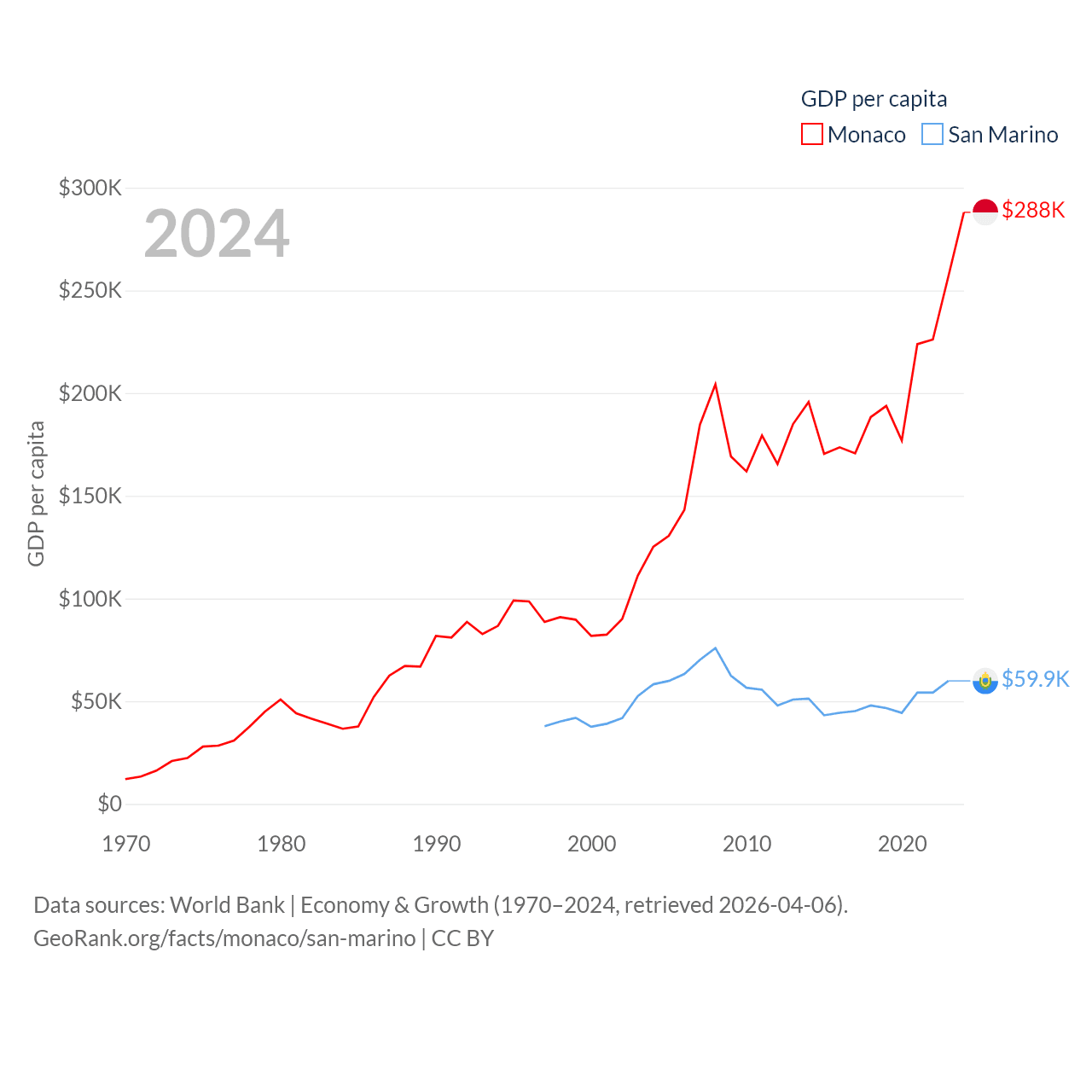 By GDP, Monaco ranks 152/197 ($11.1B) and San Marino ranks 180/197 ($2.03B). By GDP per capita, Monaco ranks 1/197 ($288,001), while San Marino ranks 15/197 ($59,880).