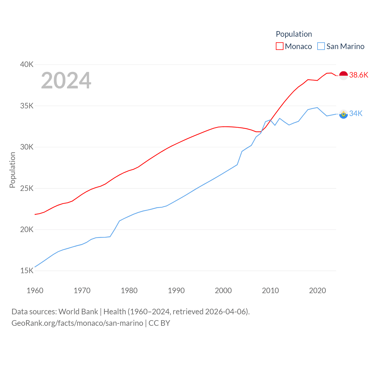 Monaco has a population of 38.6K (ranked 191/197), compared with 34K in San Marino (ranked 193/197). Monaco's land area is 0.8 sq mi versus 23.2 sq mi for San Marino (ranked 196th vs. 193rd).