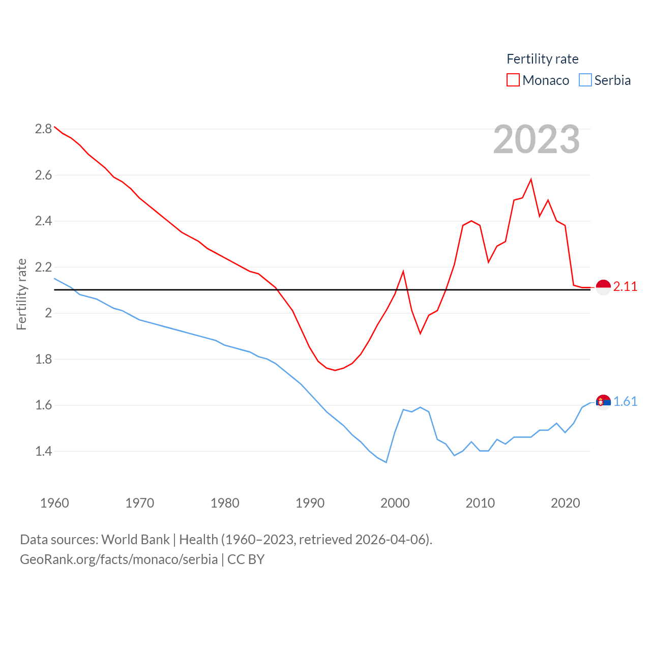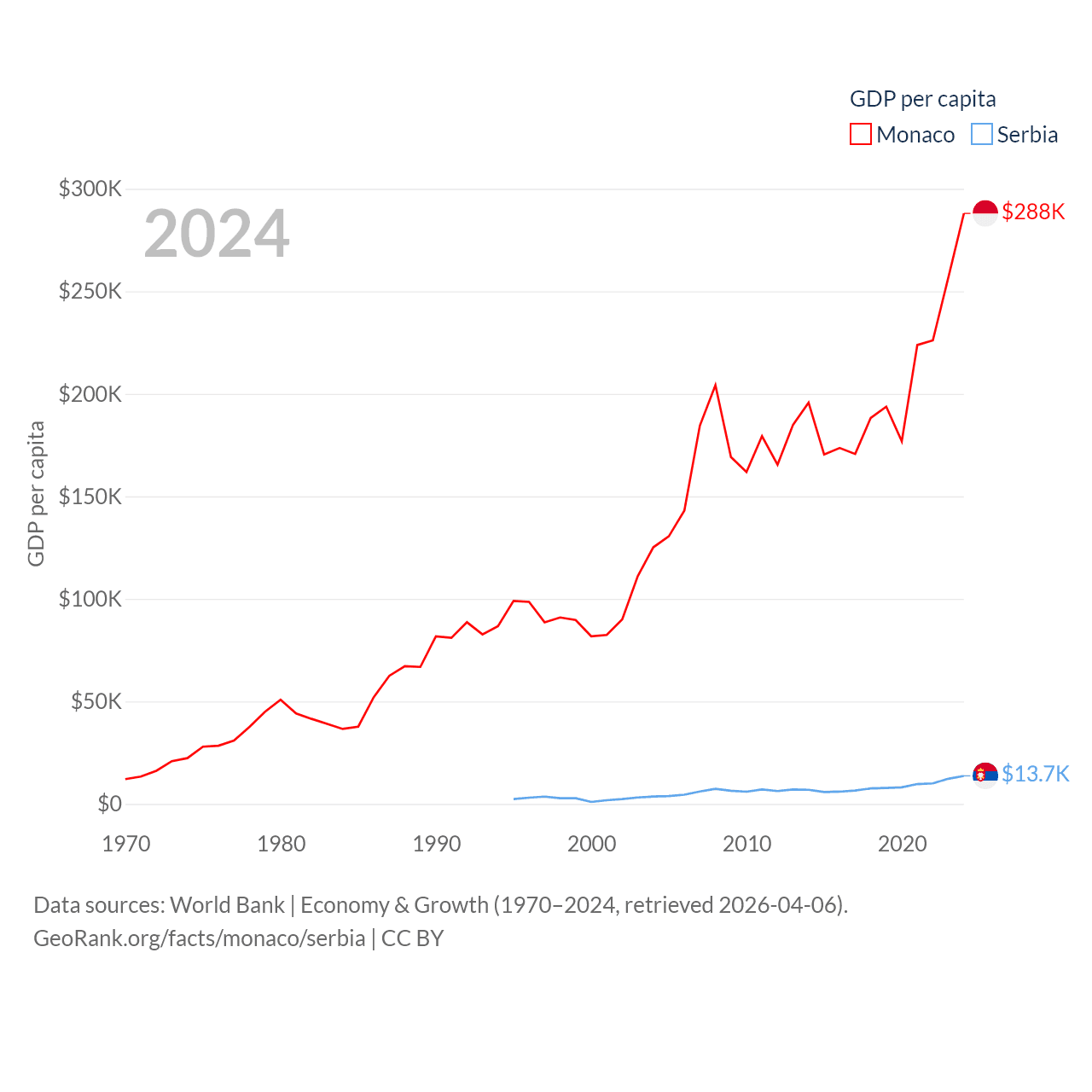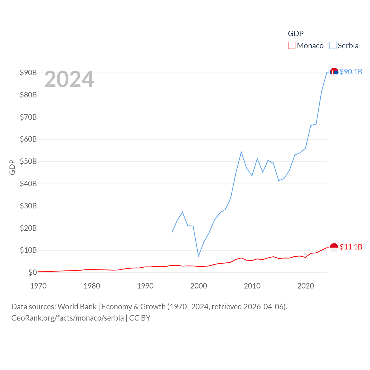 By GDP, Monaco ranks 152/197 ($11.1B) and Serbia ranks 76/197 ($90.1B). By GDP per capita, Monaco ranks 1/197 ($288,001), while Serbia ranks 73/197 ($13,679).