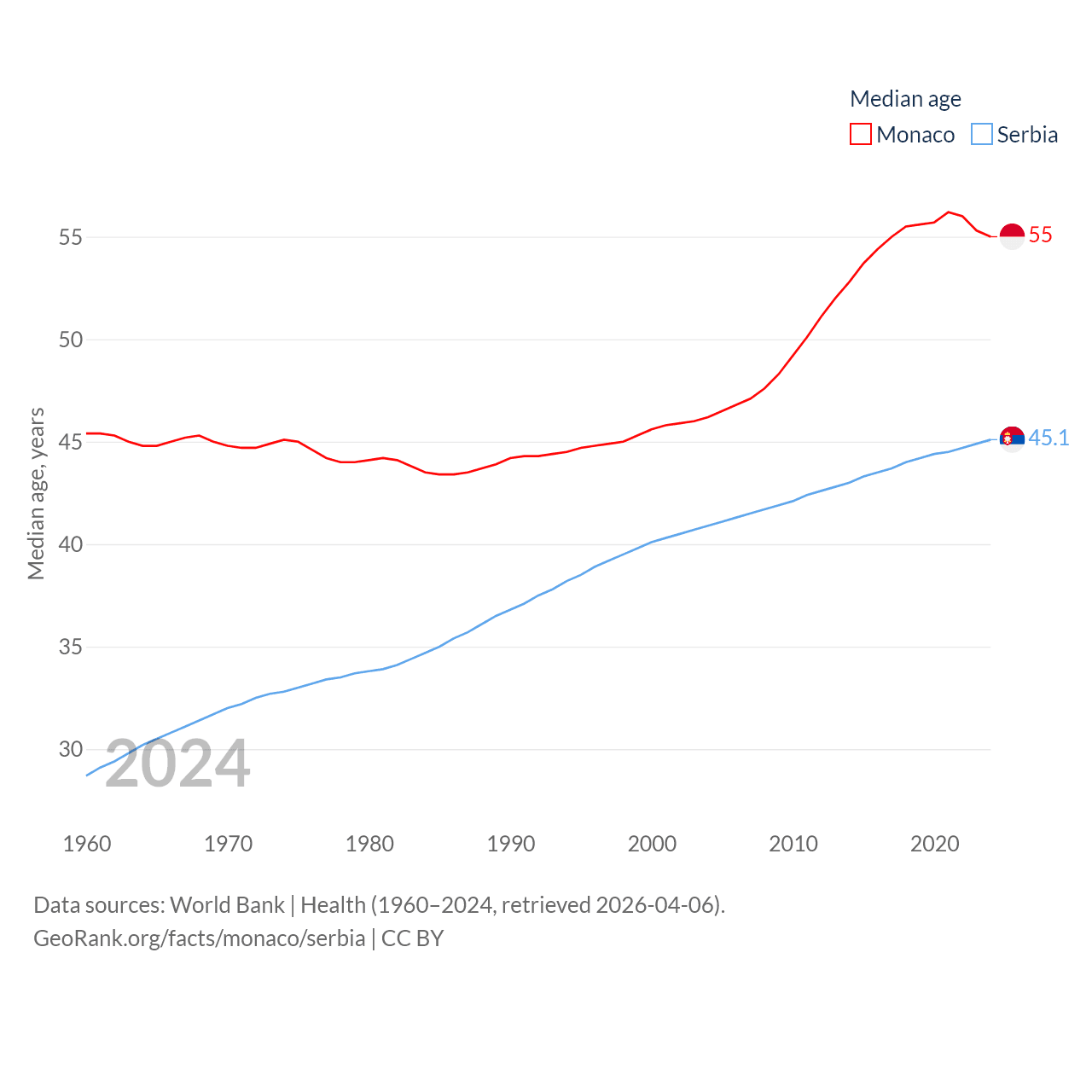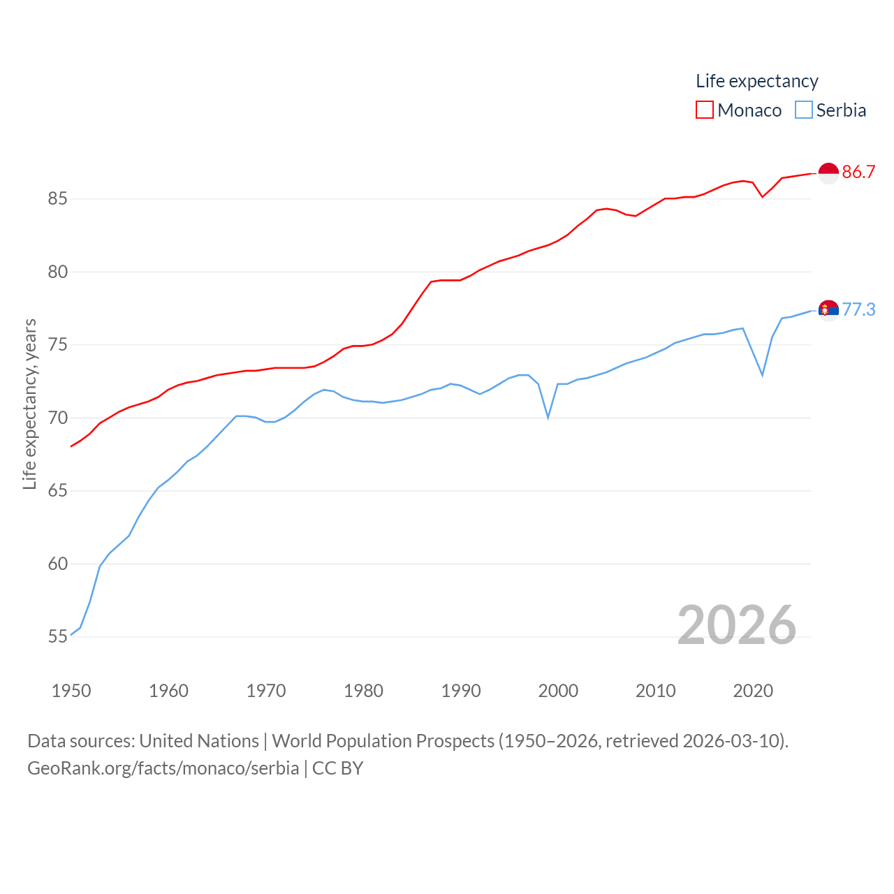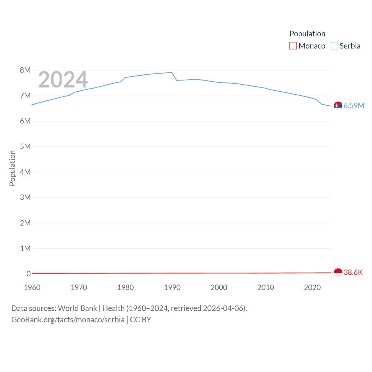 Monaco has a population of 38.6K (ranked 191/197), compared with 6.59M in Serbia (ranked 109/197). Monaco's land area is 0.8 sq mi versus 32,467 sq mi for Serbia (ranked 196th vs. 111th).