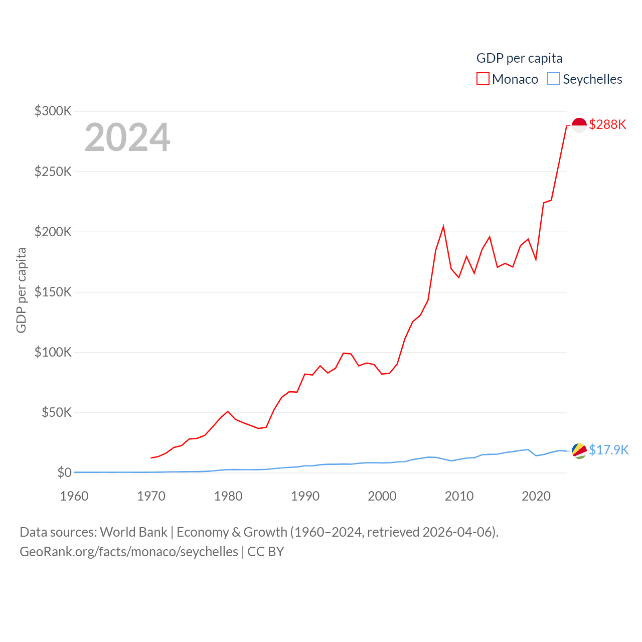 By GDP, Monaco ranks 152/197 ($11.1B) and The Seychelles ranks 178/197 ($2.17B). By GDP per capita, Monaco ranks 1/197 ($288,001), while The Seychelles ranks 63/197 ($17,859).