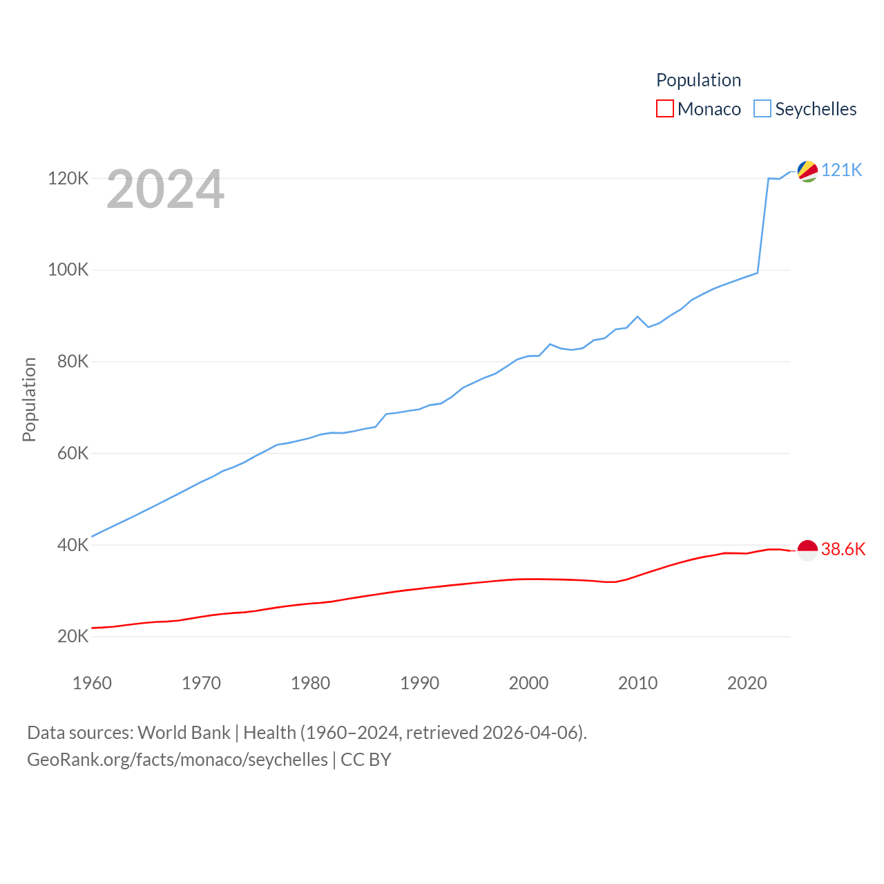 Monaco has a population of 38.6K (ranked 191/197), compared with 121K in The Seychelles (ranked 181/197). Monaco's land area is 0.8 sq mi versus 177.6 sq mi for The Seychelles (ranked 196th vs. 181st).