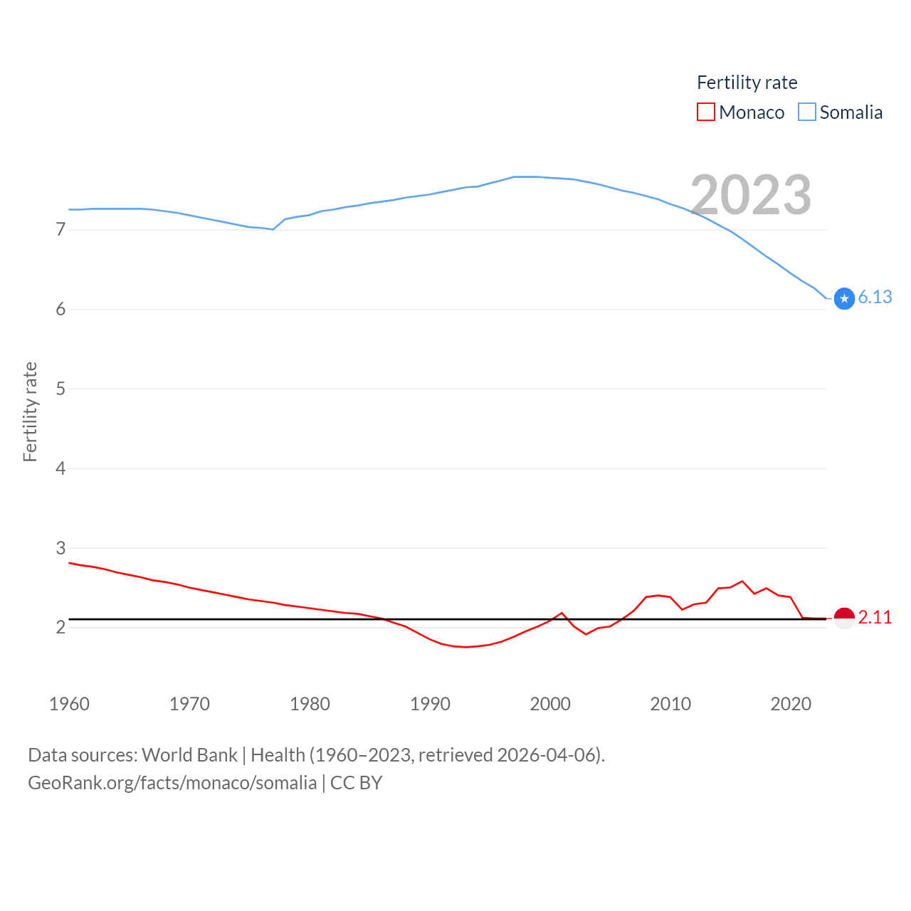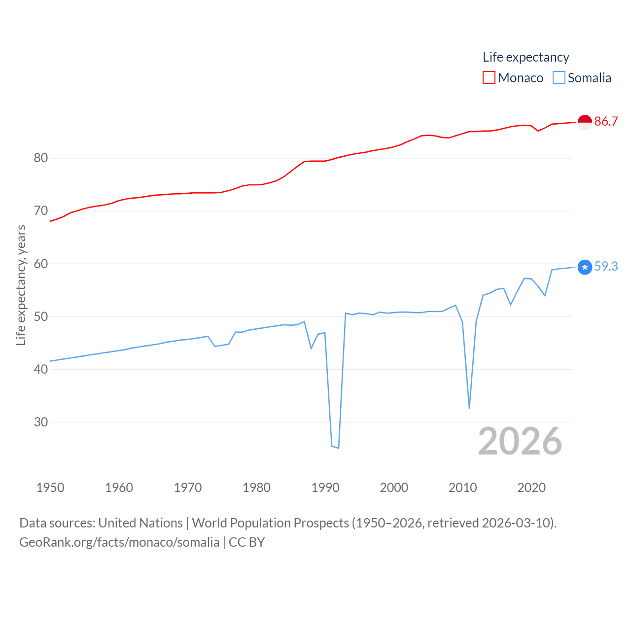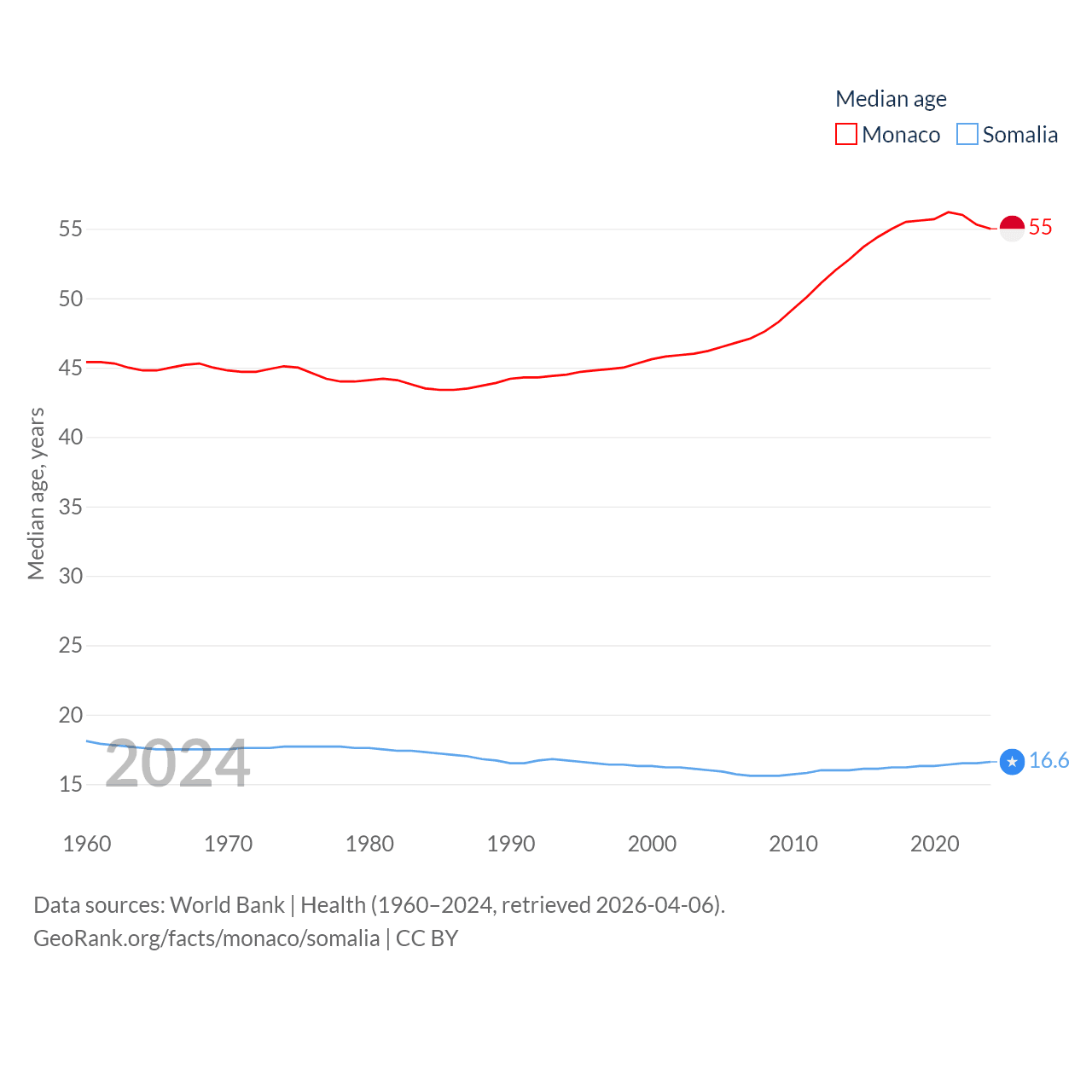 Monaco has a population of 38.6K (ranked 191/197), compared with 19M in Somalia (ranked 68/197). Monaco's land area is 0.8 sq mi versus 242,217 sq mi for Somalia (ranked 196th vs. 42nd).