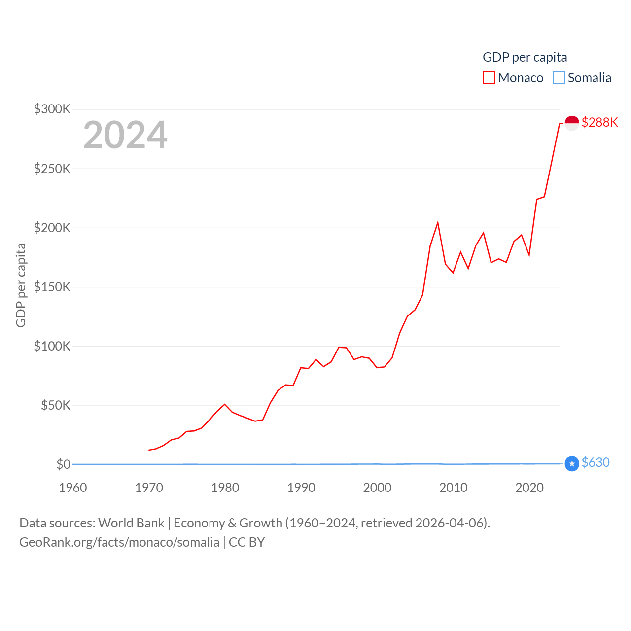 By GDP, Monaco ranks 152/197 ($11.1B) and Somalia ranks 150/197 ($12B). By GDP per capita, Monaco ranks 1/197 ($288,001), while Somalia ranks 192/197 ($630).