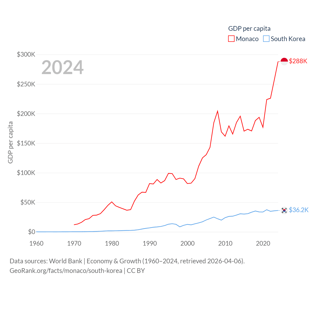 By GDP, Monaco ranks 152/197 ($11.1B) and South Korea ranks 12/197 ($1.88T). By GDP per capita, Monaco ranks 1/197 ($288,001), while South Korea ranks 31/197 ($36,239).