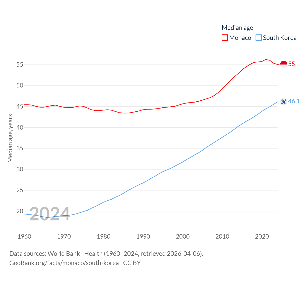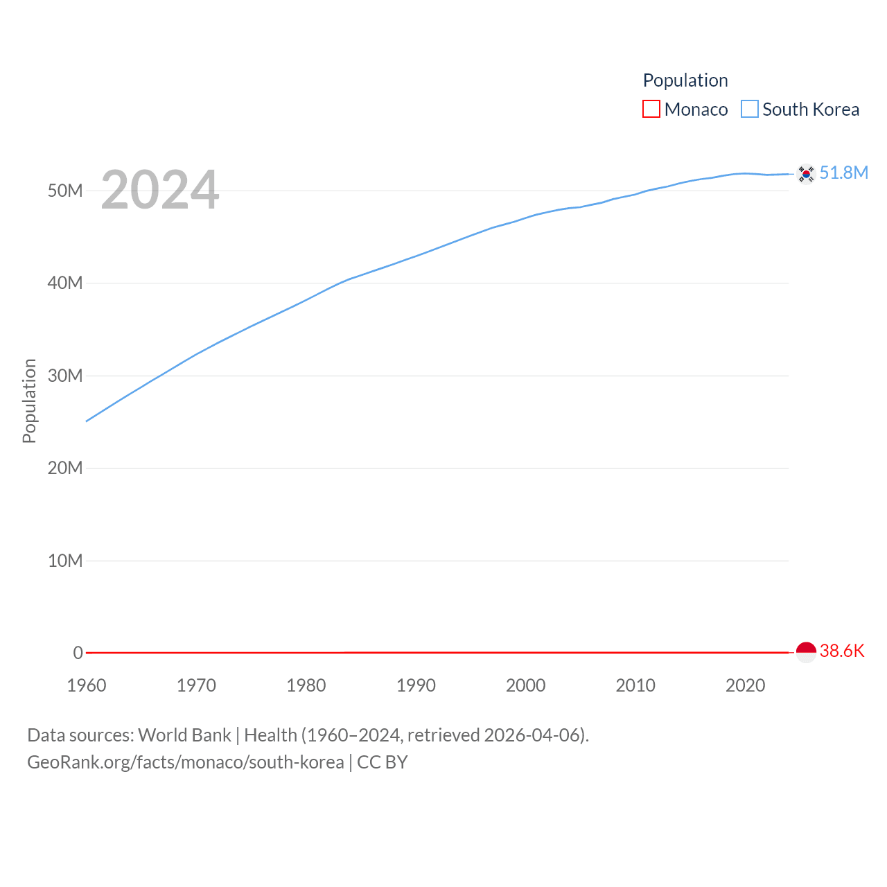 Monaco has a population of 38.6K (ranked 191/197), compared with 51.8M in South Korea (ranked 29/197). Monaco's land area is 0.8 sq mi versus 37,684 sq mi for South Korea (ranked 196th vs. 105th).