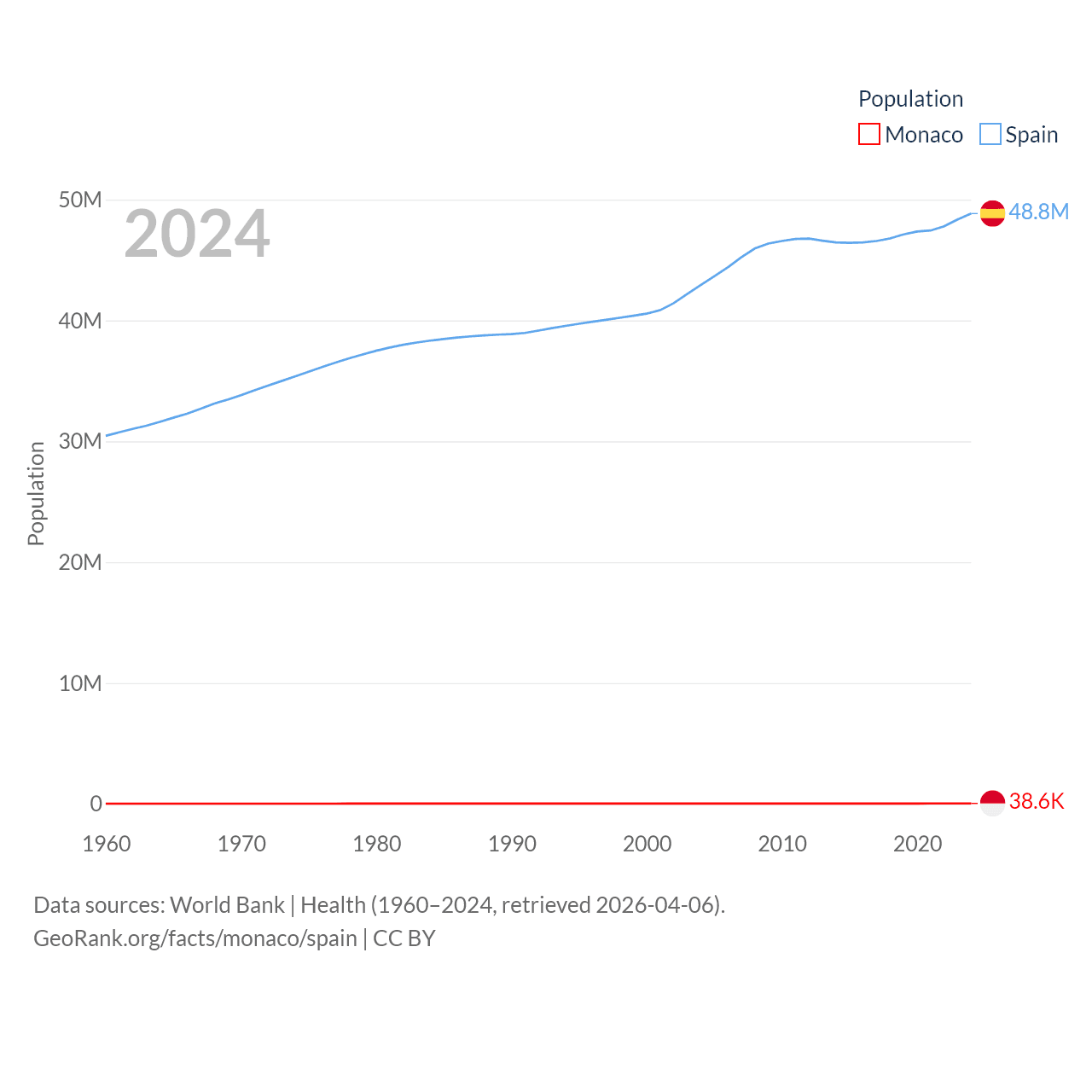 Monaco has a population of 38.6K (ranked 191/197), compared with 48.8M in Spain (ranked 32/197). Monaco's land area is 0.8 sq mi versus 192,934 sq mi for Spain (ranked 196th vs. 51st).