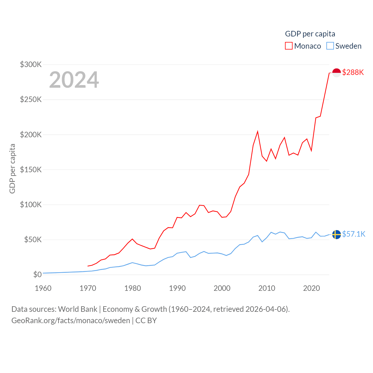 By GDP, Monaco ranks 152/197 ($11.1B) and Sweden ranks 26/197 ($604B). By GDP per capita, Monaco ranks 1/197 ($288,001), while Sweden ranks 17/197 ($57,117).