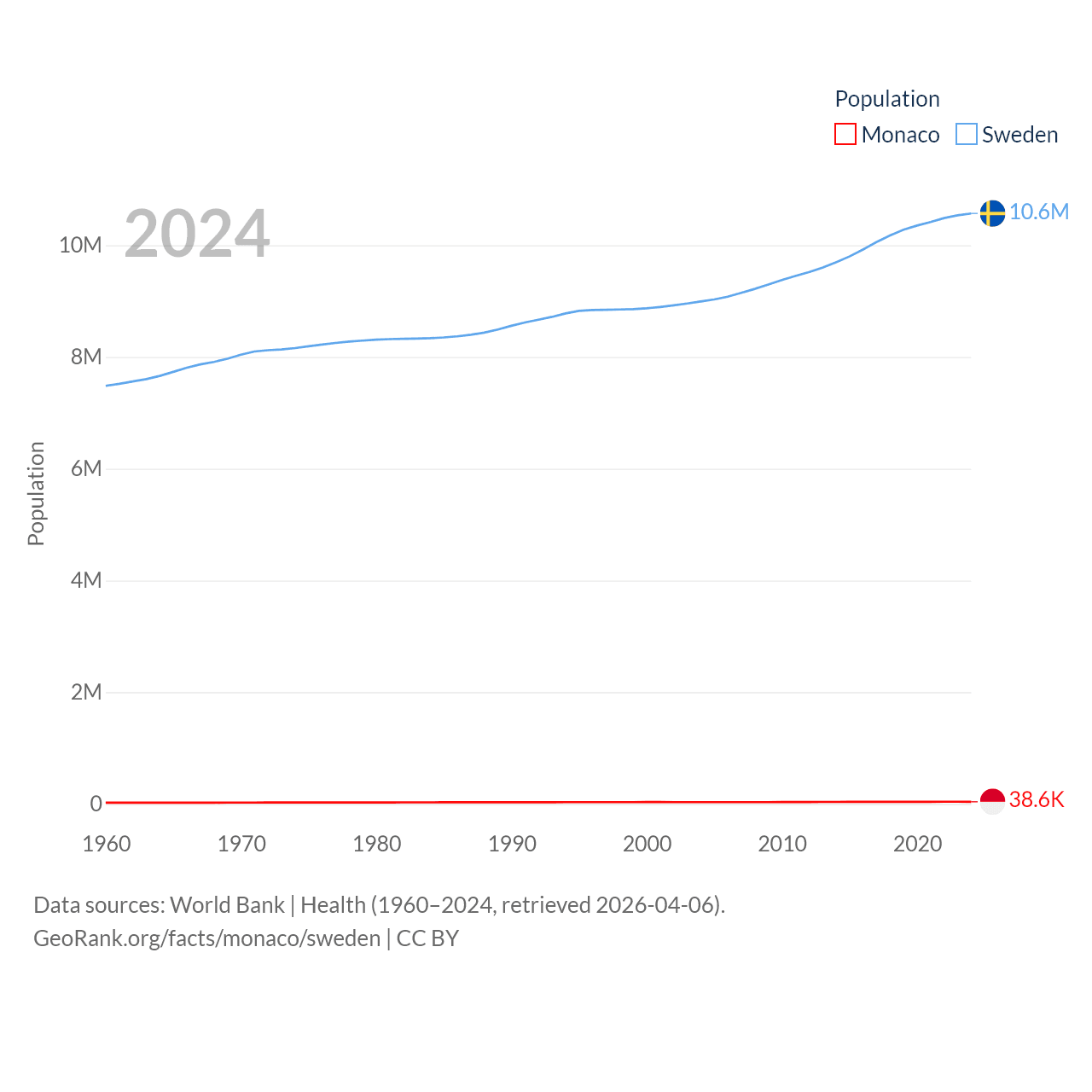 Monaco has a population of 38.6K (ranked 191/197), compared with 10.6M in Sweden (ranked 93/197). Monaco's land area is 0.8 sq mi versus 157,248 sq mi for Sweden (ranked 196th vs. 58th).