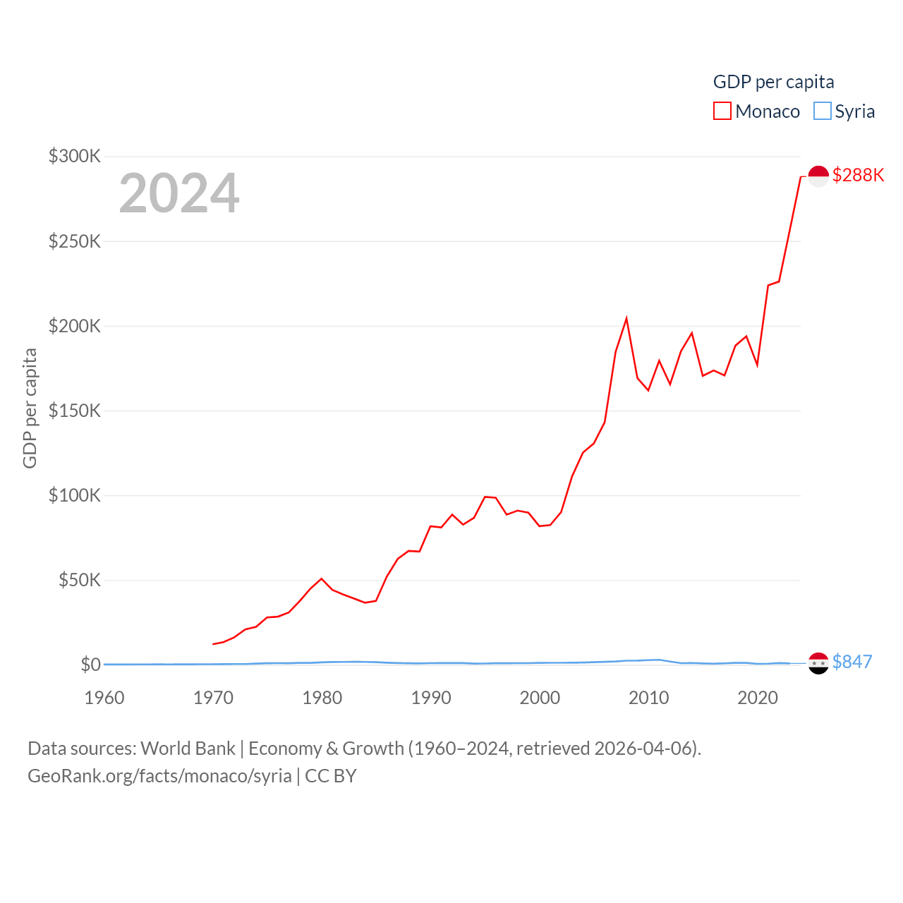 By GDP, Monaco ranks 152/197 ($11.1B) and Syria ranks 129/197 ($20B). By GDP per capita, Monaco ranks 1/197 ($288,001), while Syria ranks 185/197 ($847).